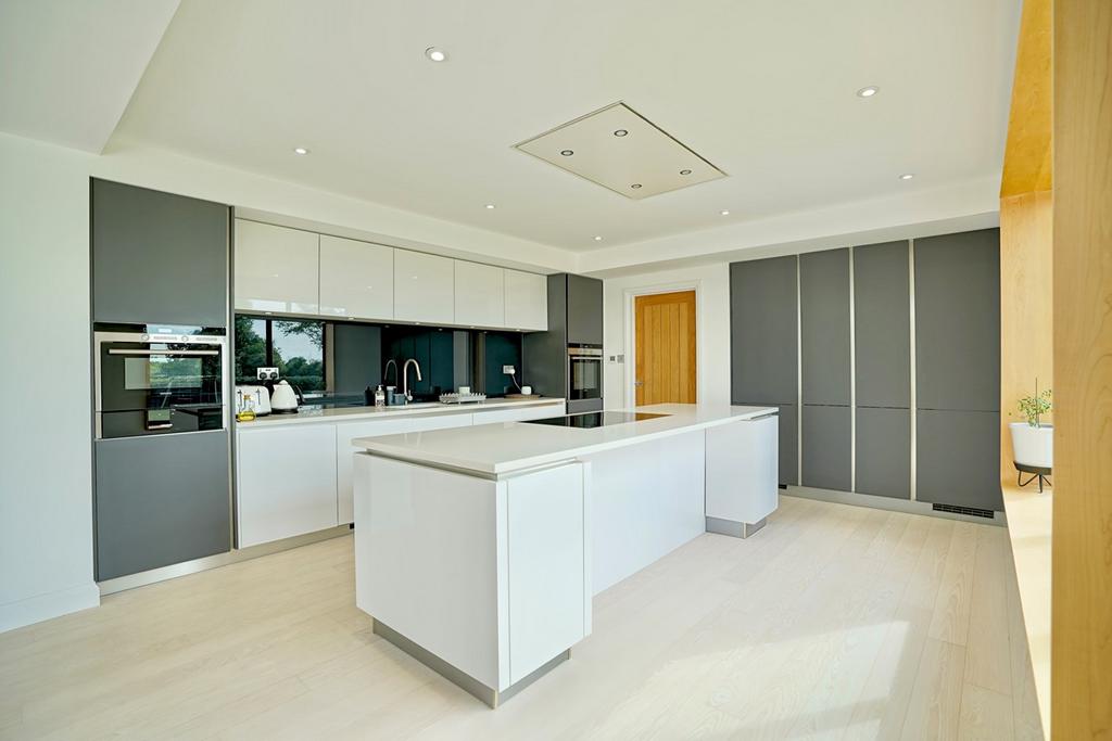 Fitted in a bespoke contemporary range of base and wall mounted cabinets with Quartz work surfaces, inset stainless steel sink unit with mono bloc mixer tap, glass surrounds, a range of high end Siemens appliances incorporating combination microwave, warming drawer, conventional oven and five ring induction hob with ceiling mounted recessed extractor unit, central island incorporating drawers and pan drawers with three stool breakfast bar, sliding shelf larder units, larder fridge and freezer, fitted in a contrasting tones of grey and white cabinetry, window to rear aspect, Boen engineered wood flooring.