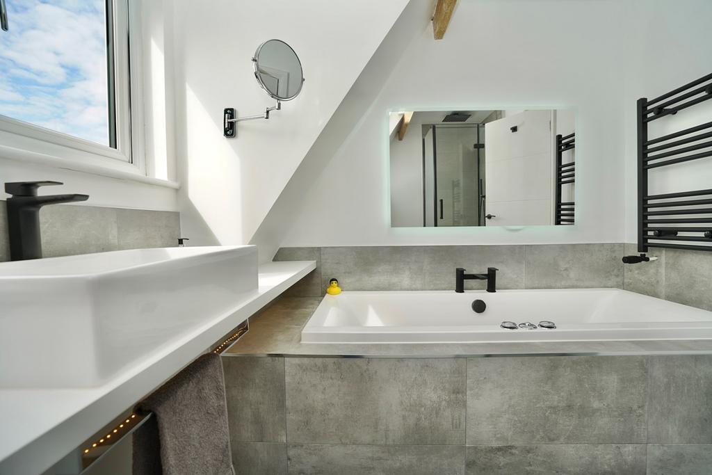 Fitted in a four piece contemporary white suite comprising double ended spa bath with mixer tap, anthracite heated towel rail, surface mounted contemporary sink unit with mixer tap, shaver point, low level WC, screened black framed shower enclosure with overhead shower unit and additional hand mixer shower, porcelain tiling, UPVC window to garden aspect, composite floor covering.