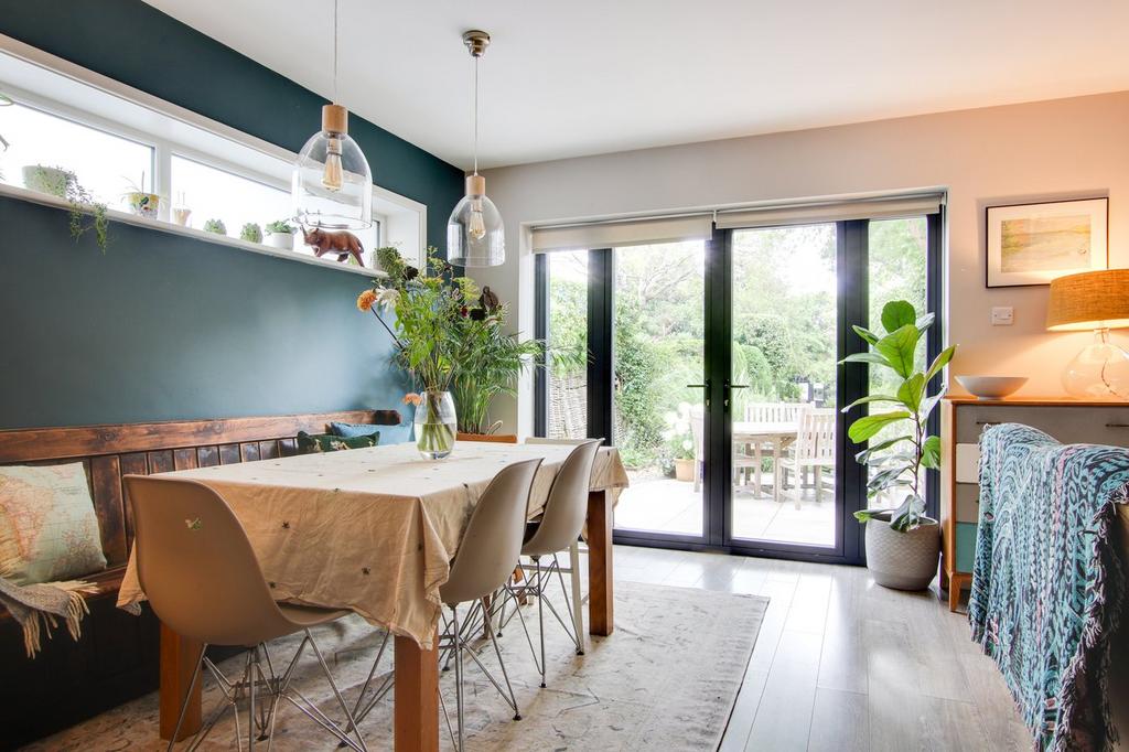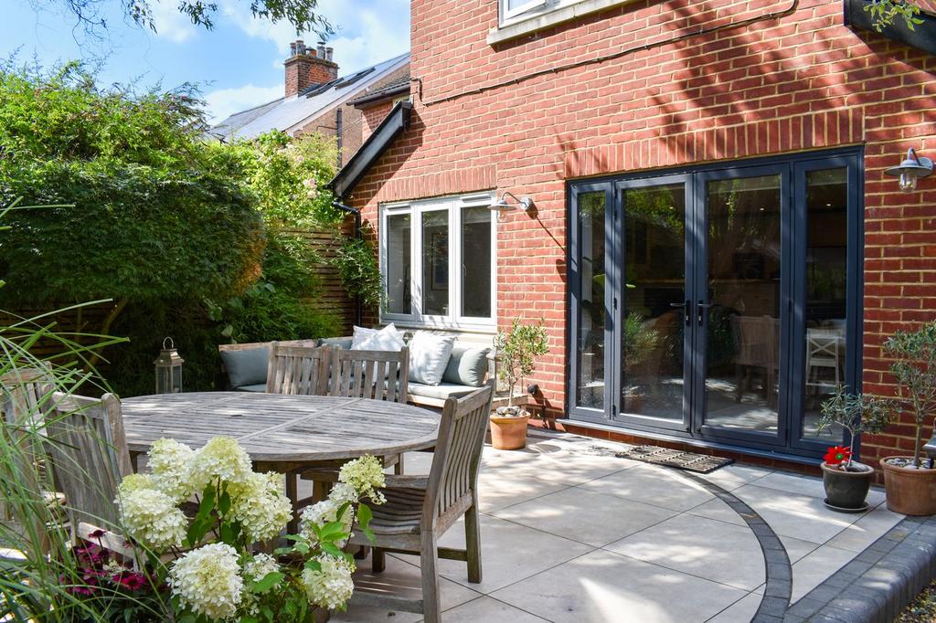 The exceptional open plan kitchen/dining/living area is of particular note and really is the hub of the house with French doors leading onto the south facing patio. The kitchen has been designed with entertaining in mind with a large breakfast bar and an area for sofas to relax in. The dining area enjoys leafy views over the rear garden. There is also a separate utility room with storage cupboards, and plumbing for both washing machine and tumble dryer and access to a stylish shower wet room.