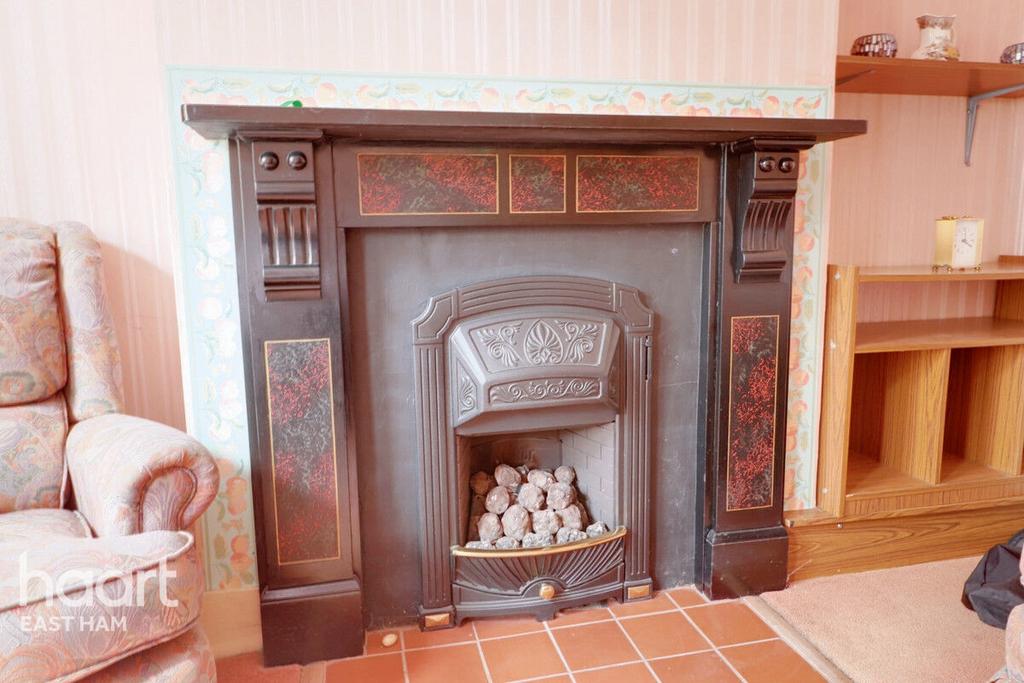 Double glazed bay window , Victorian style fireplace surround with cast iron insert .