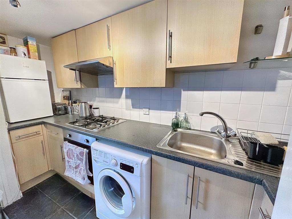 Kitchen Area - A cleverly designed recessed kitchen with a good range of timber-effect cupboards and drawers with round edged worksurfaces and tiled splashbacks in between. Stainless steel sink with drainer. Electric oven with four-ring gas hob and extractor hood over. Space and plumbing for washer/dryer. High level glass shelves adjacent to a fitted cupboard housing fuse board and consumer unit. Adjustable ceiling spotlights, tiled flooring.