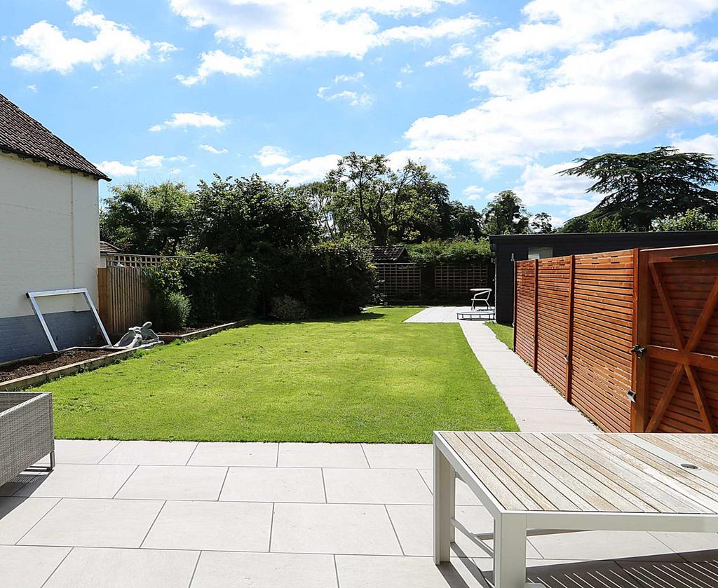 Good sized, south-facing rear garden has been relandscaped to include a large ceramic tiled sun terrace for summer dining and entertaining, with bi-fold door access from the new kitchen/living/breakfast room.
