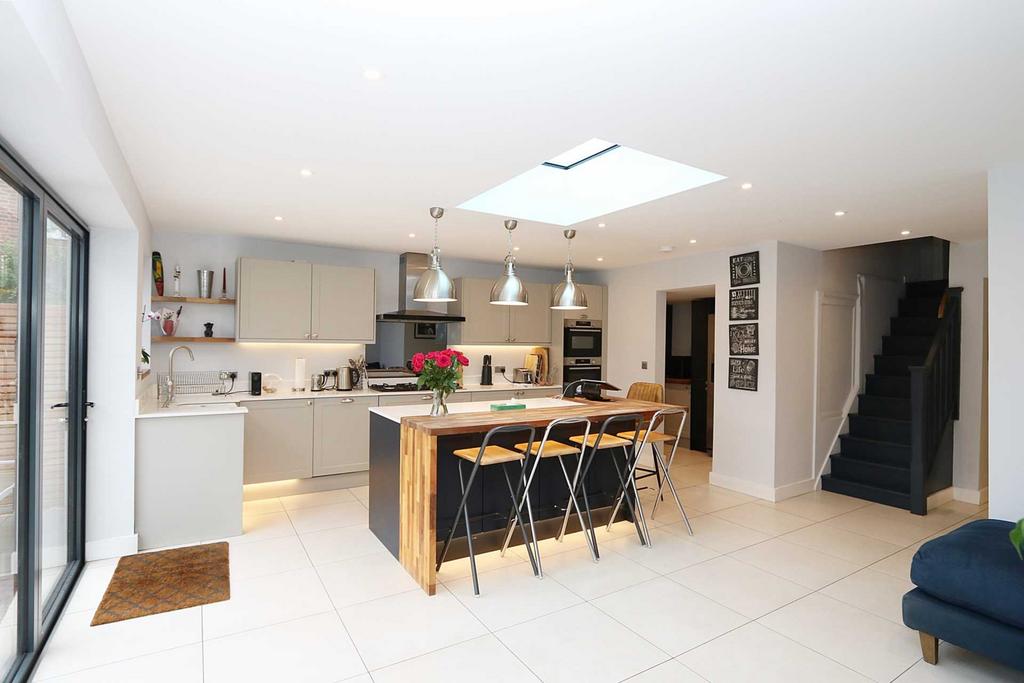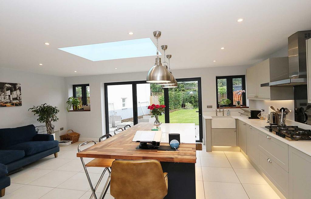 • Outstanding, spacious large kitchen/living/breakfast room with skylight and bi-fold doors opening onto the sun terrace. A wonderful central island breakfast bar, wide quartz working surfaces, Siemens stainless steel 5 ring gas hob, fitted Bosch single oven, fitted Bosch oven/microwave, fitted Neff dishwasher