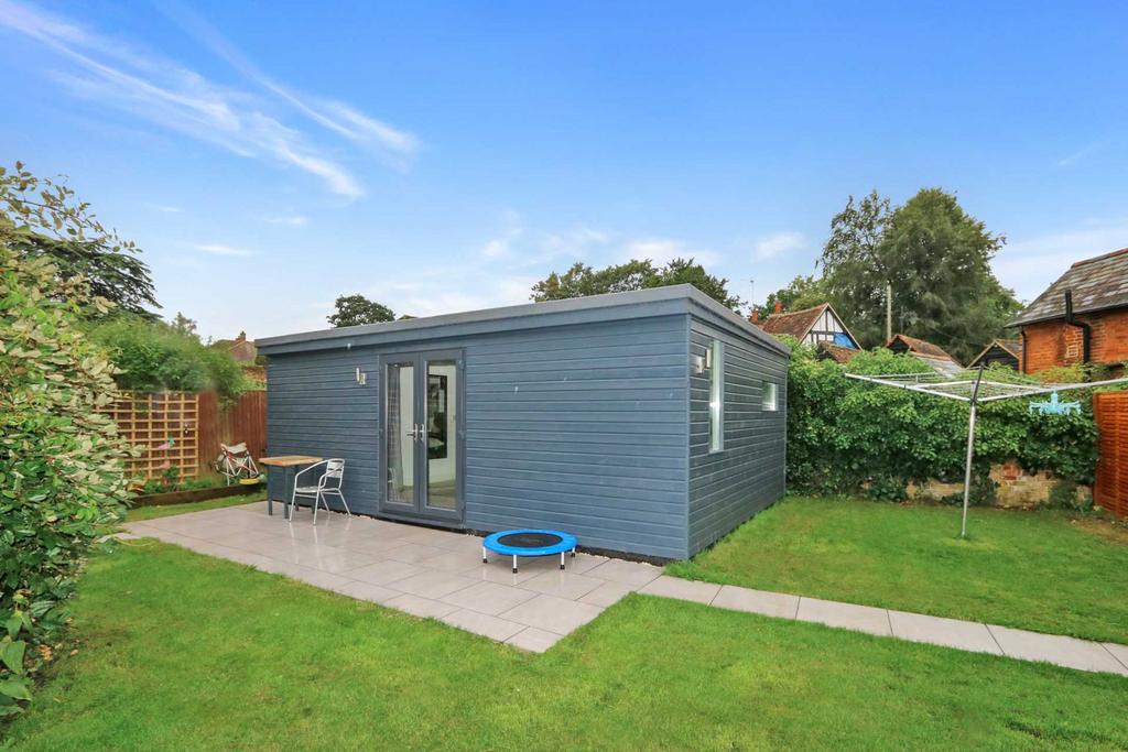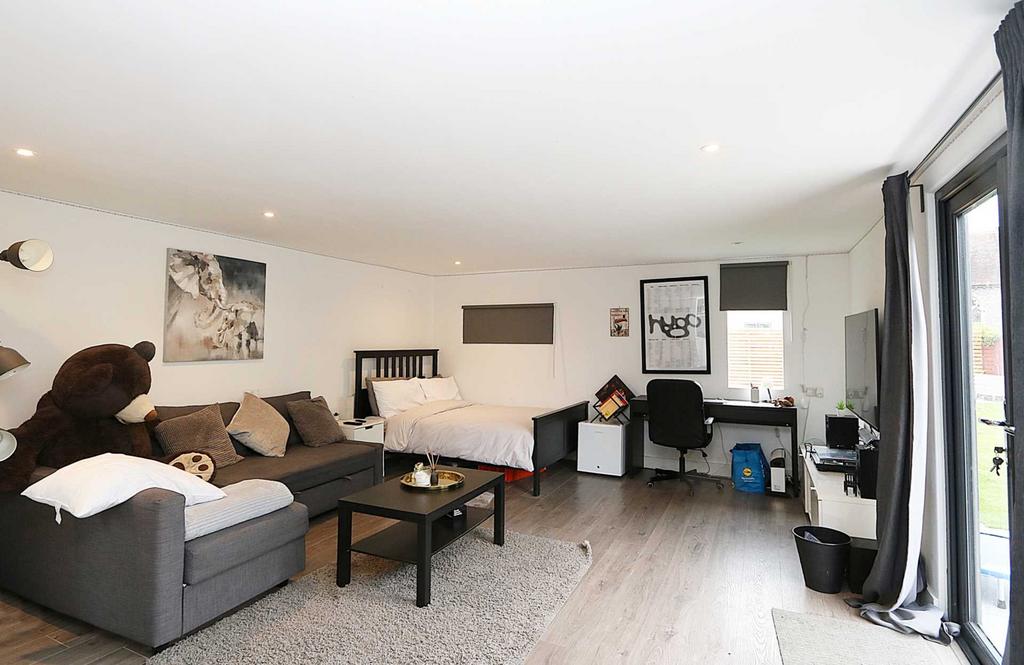 • Modern garden annexe studio, with French doors which open onto a ceramic tiled terrace. Interior is light and bright and highly insulated with central heating. Grey oak effect flooring, and a pretty ensuite shower room with thermostatically controlled shower