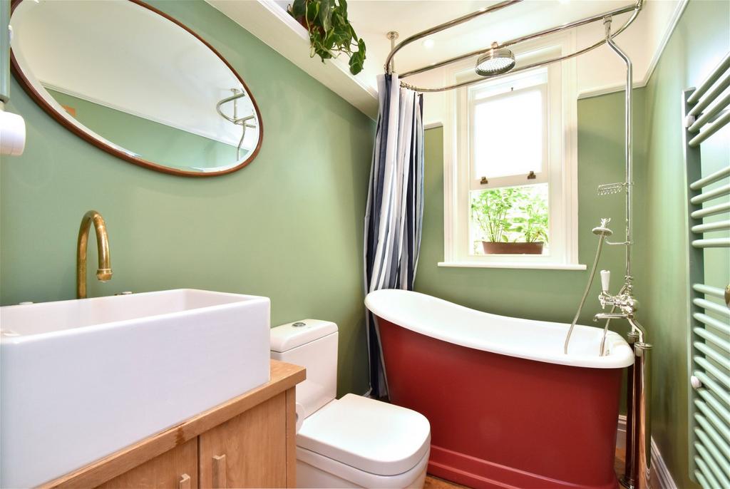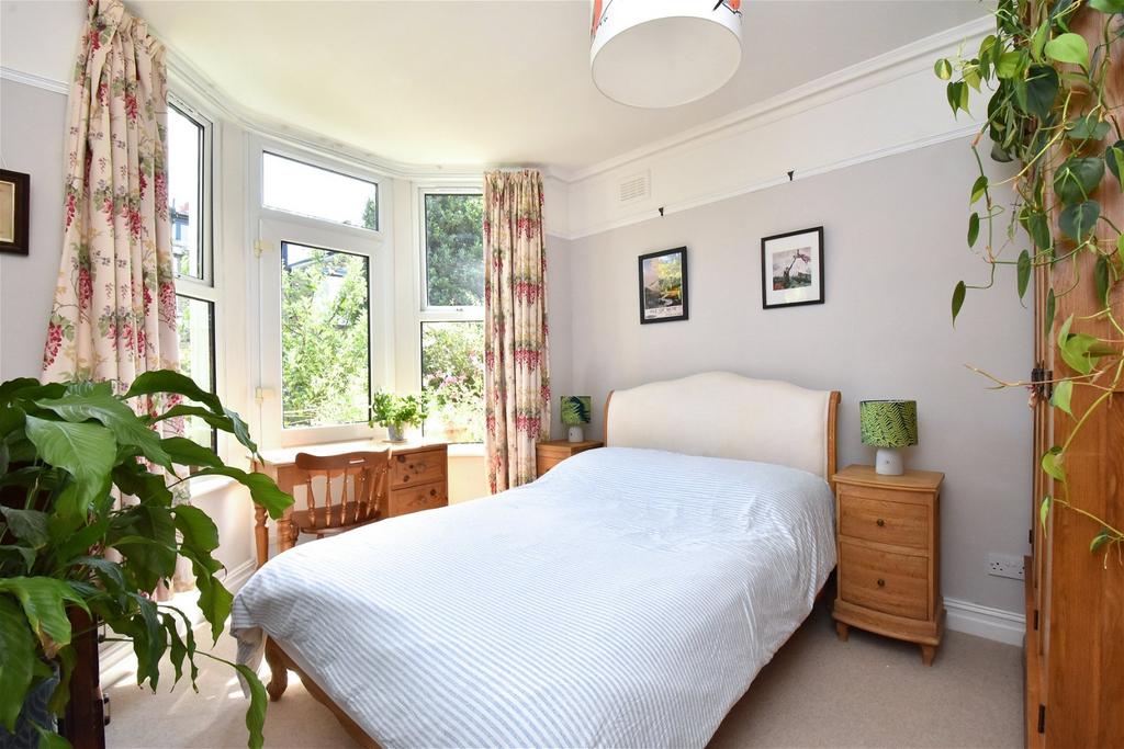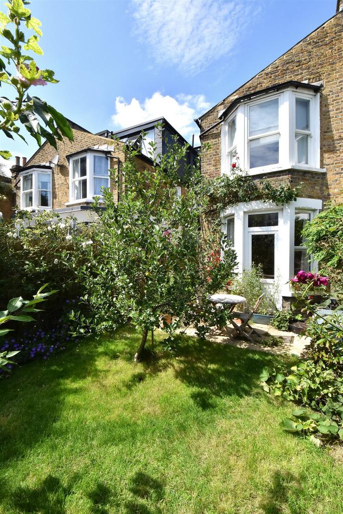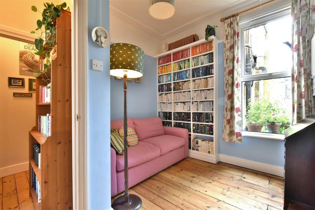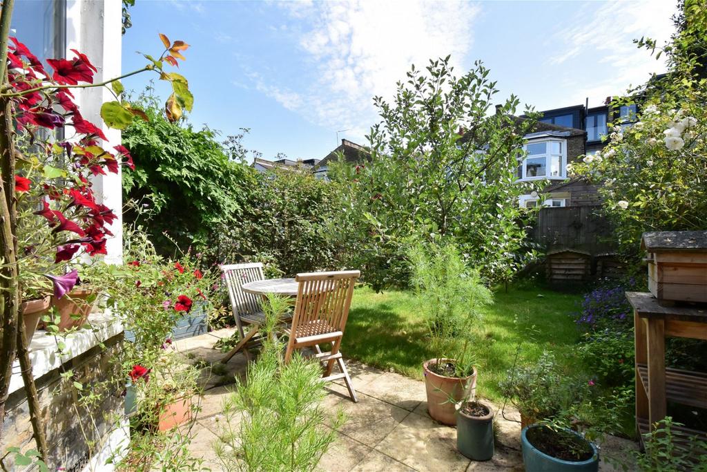 In the master bedroom, a wide bay window opens on to the leafy rear garden. The characterful and newly installed bathroom features a freestanding bath, reclaimed wooden floor, butler sink, and brass and nickel pipework. Additional storage is provided by a spacious cellar.