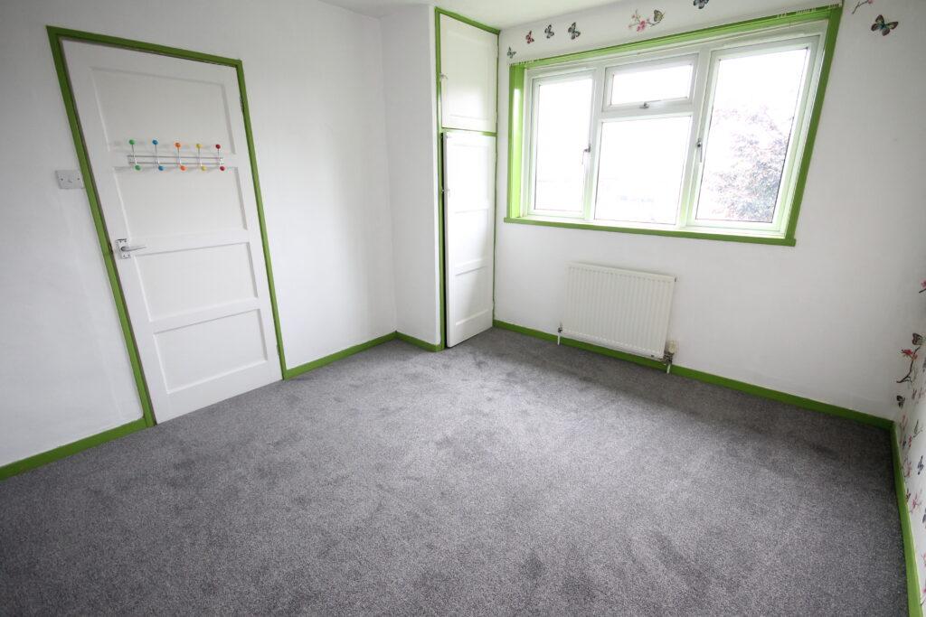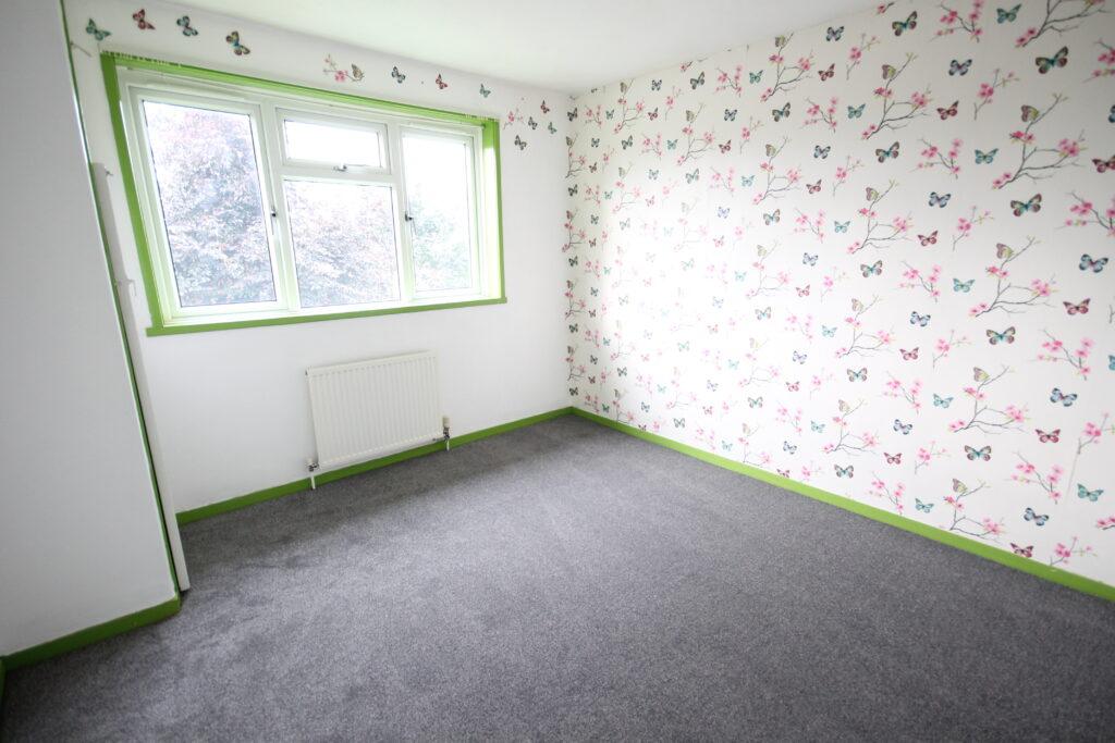 Bedroom 2: The second bedroom, although smaller, still provides ample space for a double bed and furnishings. The white walls are joined by butterfly detailing, alongside dark carpet and green trim. The room also features built-in storage and a large window.