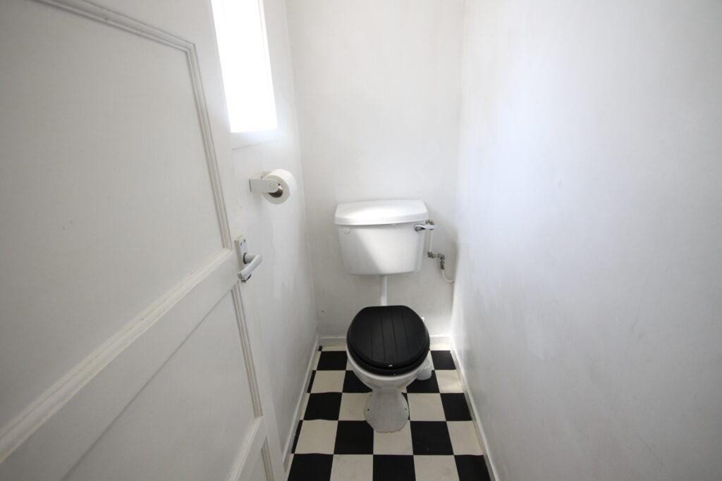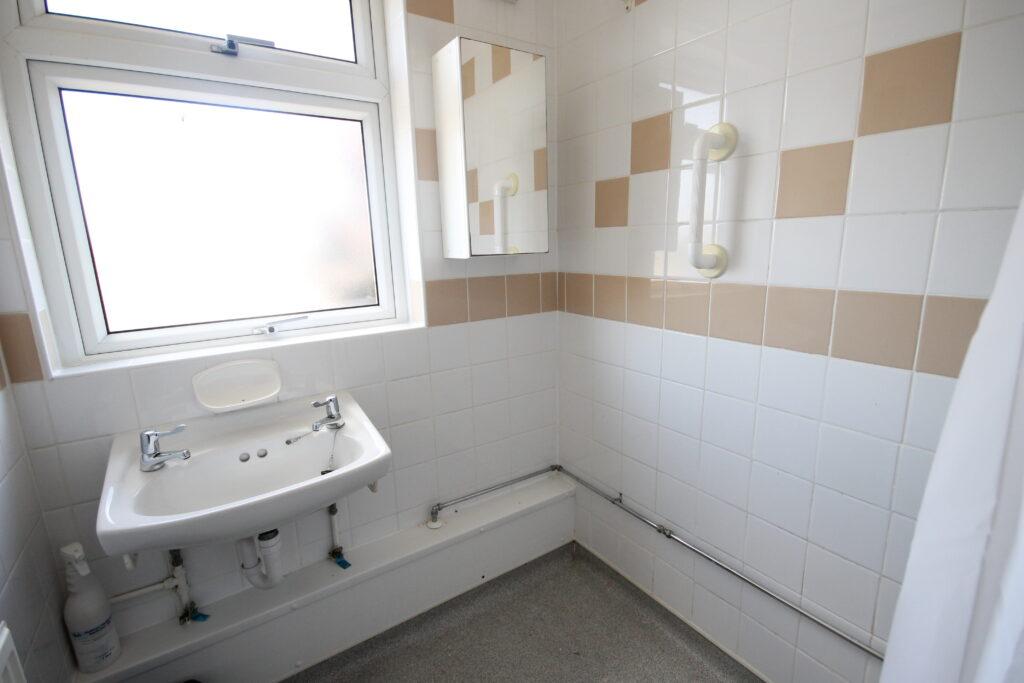 BATHROOM (First Floor): This property provides you with a bathroom featuring white and beige tiling, grey flooring, sink, shower/bath combination, and frosted window for your convenience. There is also a separated W.C with a small window.