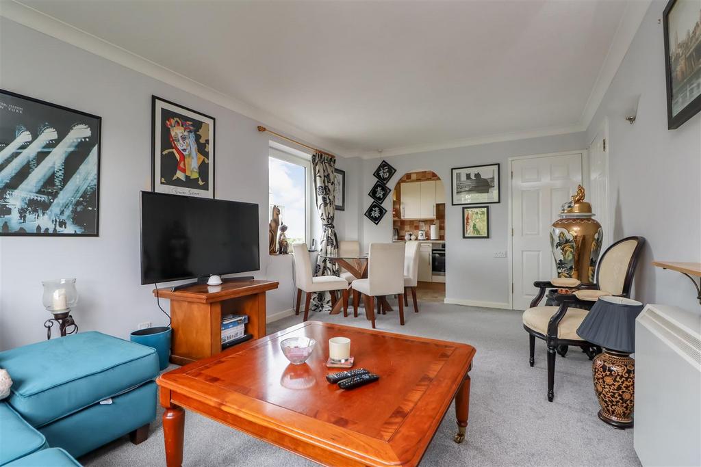 A lift and stairs provide access to the second floor. From the front door of the apartment, a hallway leads into a large double bedroom with fitted wardrobe. Another door leads into the large living room with plenty of room for sofa, armchair, and table and chairs. This room also benefits from dual aspects providing plenty of natural light to fill the room. There is a well-equipped kitchen to the rear of the living room providing a good range of base and wall units, a fitted oven and space for a freestanding fridge freezer.