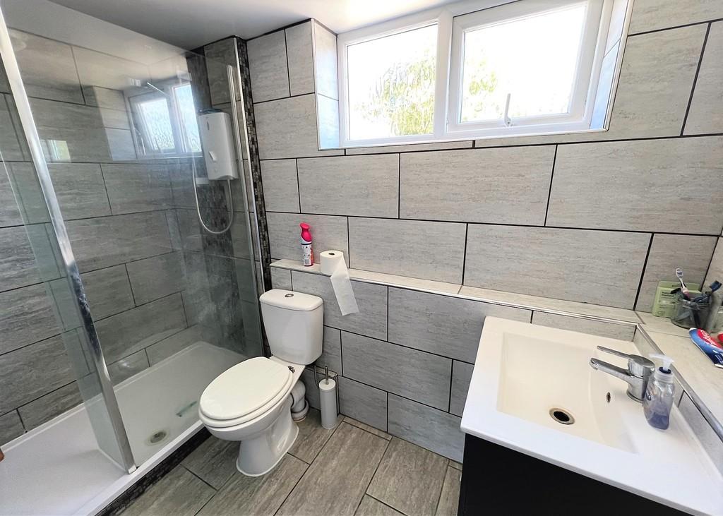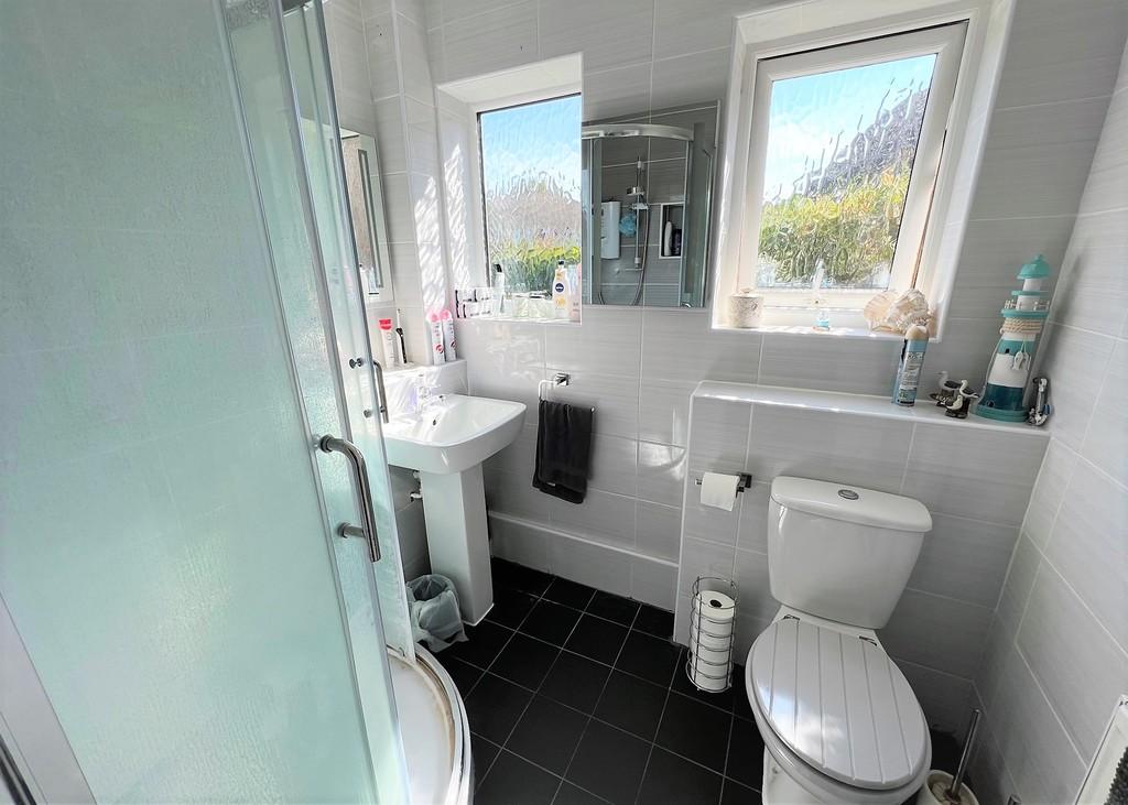 SHOWER ROOM 6' 11" x 5' 9" (2.11m x 1.75m) Having tiled walls and floor, fitted with a contemporary suite comprising of a corner glazed shower enclosure and electric shower fitted, close coupled dual flush wc, pedestal wash hand basin with monobloc mixer tap, radiator, two Upvc double glazed windows.
