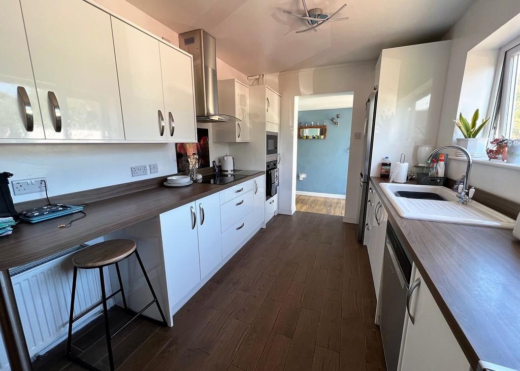 KITCHEN 15' 2" x 8' 5" (4.62m x 2.57m) Fitted with a comprehensive range of high gloss fronted base and wall mounted units comprising of cupboards and drawers, work surface with inset ceramic sink and mixer tap, plumbing and space for dishwasher, further space for upright appliance, radiator, floor standing oil fired central heating boiler, built-in electric oven and microwave with matching ceramic hob and cooker hood above, tiled splash backs.