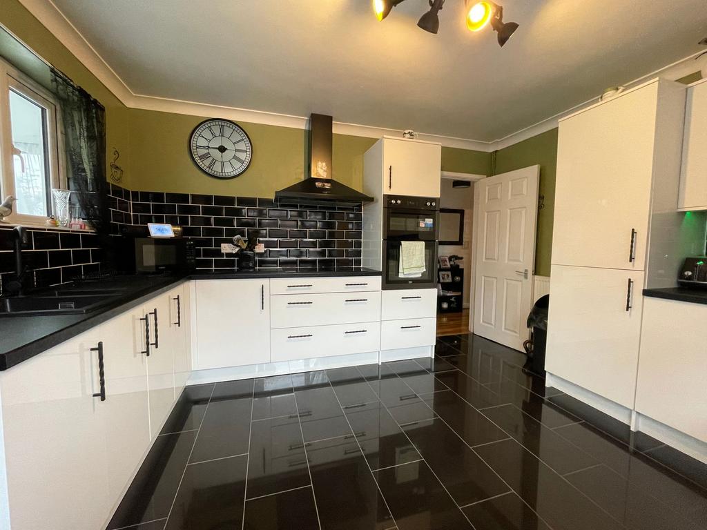 Window to side and window to rear, modern contemporary style fitted kitchen of wall and base cupboards, 1 1/2 composite sink and drainer with mixer taps, fitted oven hob and hood. Breakfast Bar Area, LED worktop mood lighting, Integral Fridge and Freezer, polished porcelain tile flooring, radiator, door to Conservatory/Sun Lounge.