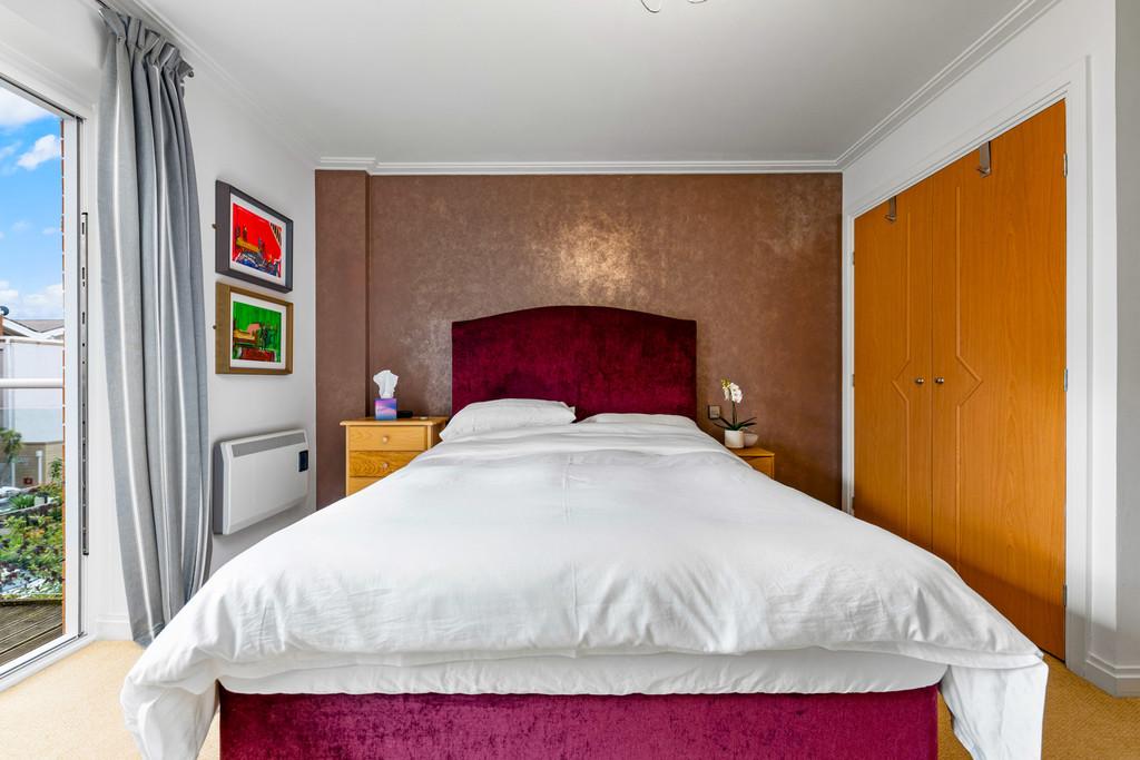 BEDROOM ONE 17' 1" x 11' 8" (5.23max x 3.56m) Double glazed uPVC sliding doors, leading to the large private balcony overlooking attractive gardens. Large double bedroom. Carpeted flooring. Built in wardrobes. Pendant light fitting. PowerPoints. Wall mounted electric panel heater. Door to en-suite: