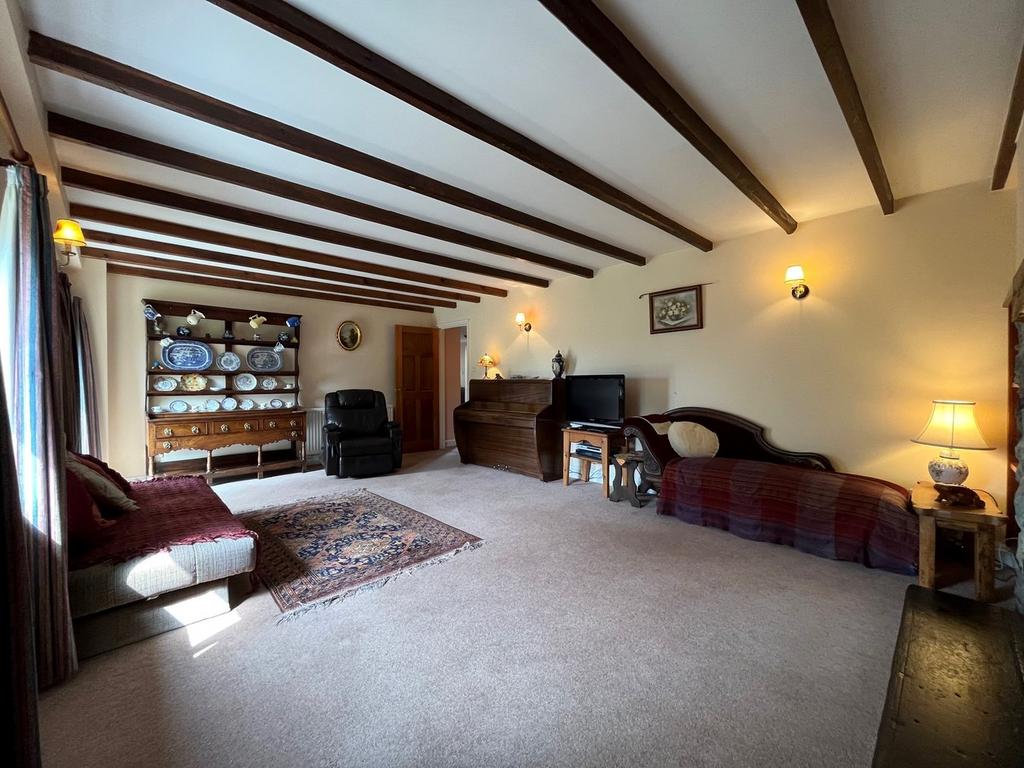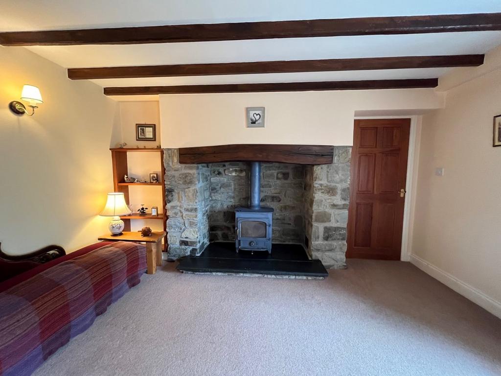 19' 9" x 13' 7" (6.02m x 4.14m) a good-sized family Living Room with inglenook stone fireplace and surround, multi fuel burner with Oak mantle, slate hearth, window and glass doors to front patio area, radiator, multiple sockets, beams to ceiling.