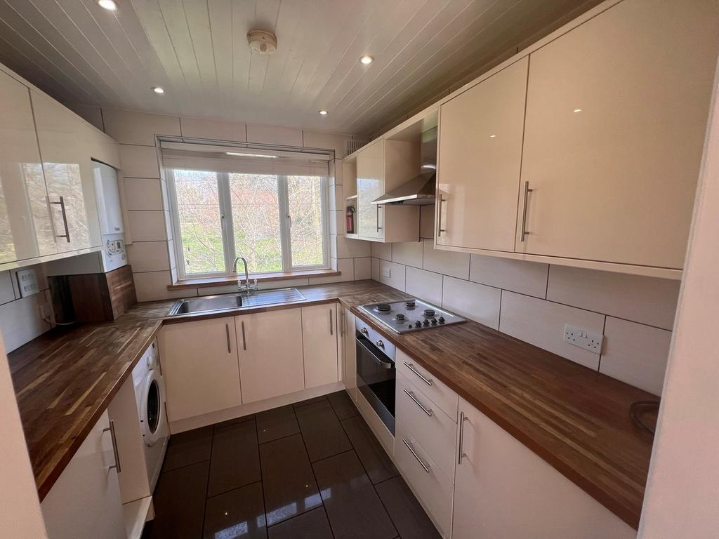 Tiled flooring and splash back, gas range with external extractor, fridge freezer, washing machine, spot lights. Combination boiler. Views over Oakmere Park.