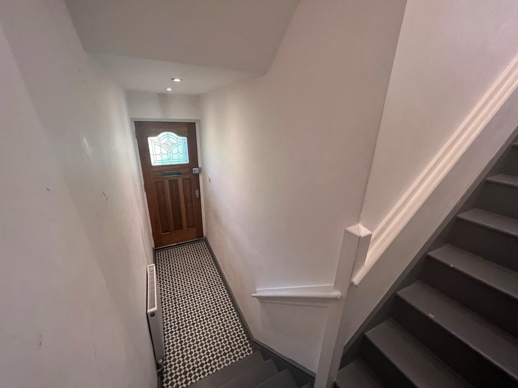 Large entrance hall with spot lights and tessellated tiled flooring and double radiator.