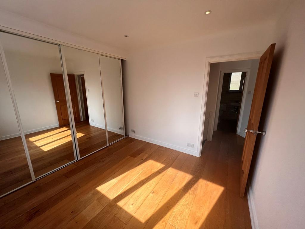 Wood flooring, spot lights, double radiator with large fitted wardrobes with mirror sliding doors. Large double glazed window facing the rear of the property.
