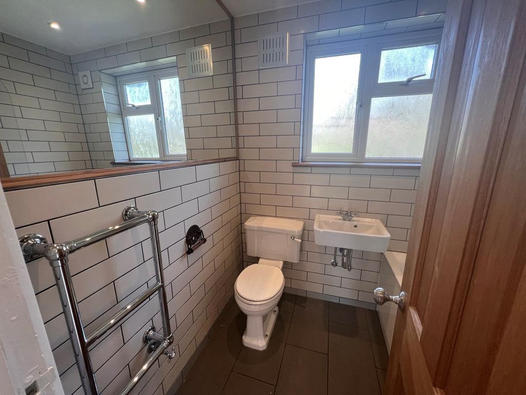 Tiled flooring with floor to ceiling tiles, bath with 2 shower heads, heated towel rail, external extractor and frosted double glazed window.