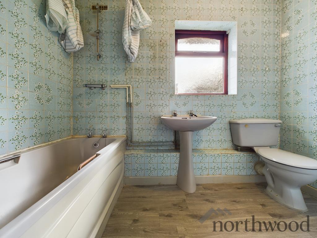 Panelled bath. Pedestal wash hand basin. Toilet. Ceramic tiled walls. Wooden casement double glazed window.