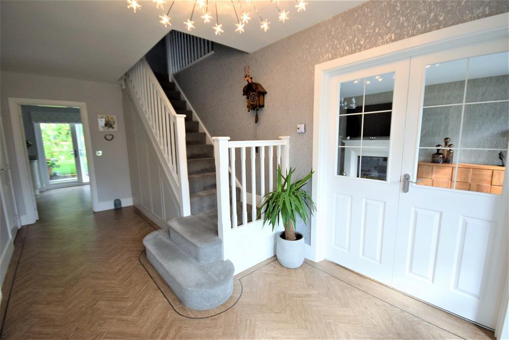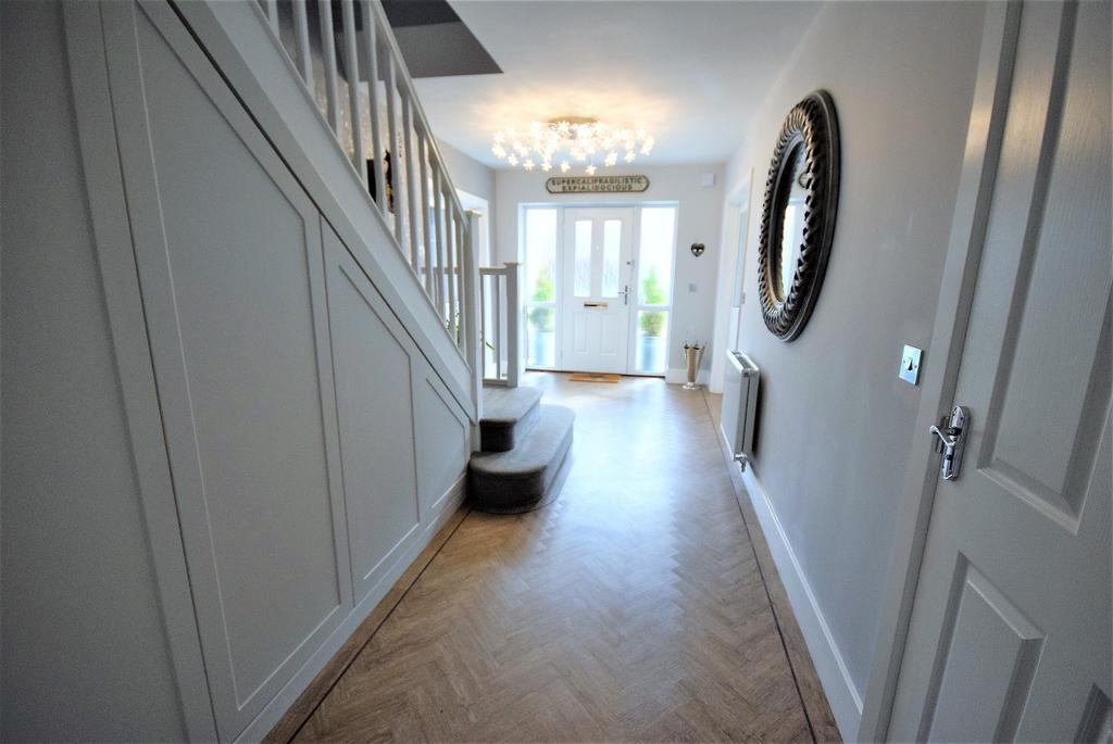 An oppulent entrance hall sets the style for this elegant family home. The living room, formal dining room, and kitchen/family space are all accessible from the hallway with its contemporary oak grain herringbone Karndean flooring with contrasting edging. A convenient guest cloakroom and discreet panelled under-stair cupboards, constructed by Hammonds, complete the ground floor layout.
