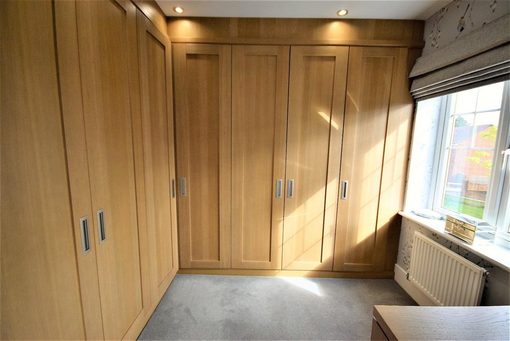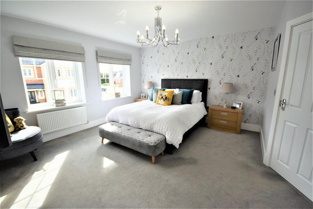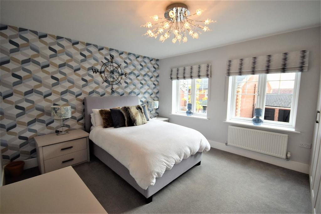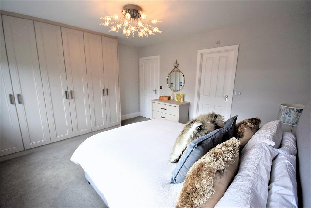 A spacious bedroom with ensuite and dressing area which has been furnished with hammonds fitted wardrobes. Decorated in netural tones with one wall having contrasting wallpaper. Two windows encourage natural light and both the ensuite and dressing room have down lights.