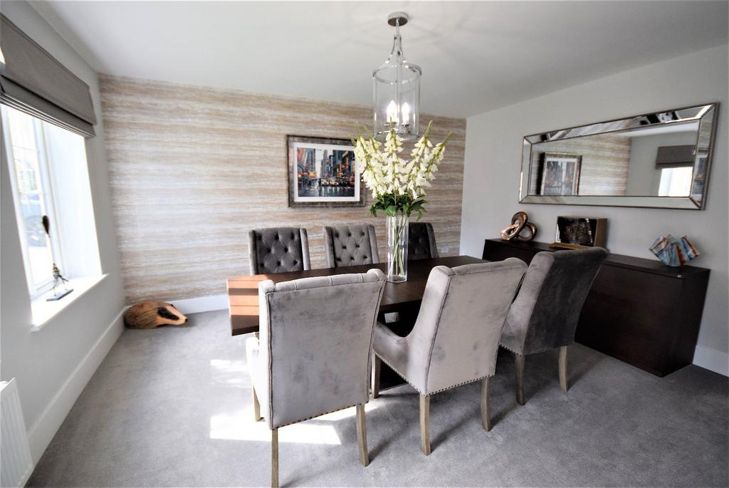 A formal dining room with luxury flooring and a high level of natural light. Double half glazed doors from the hall encourage the light to flow between the rooms. Beautifully presented with neutral tones and feature wall.