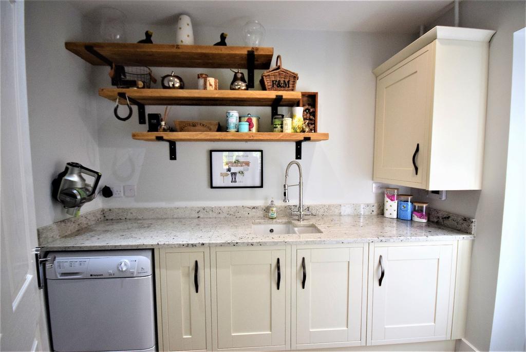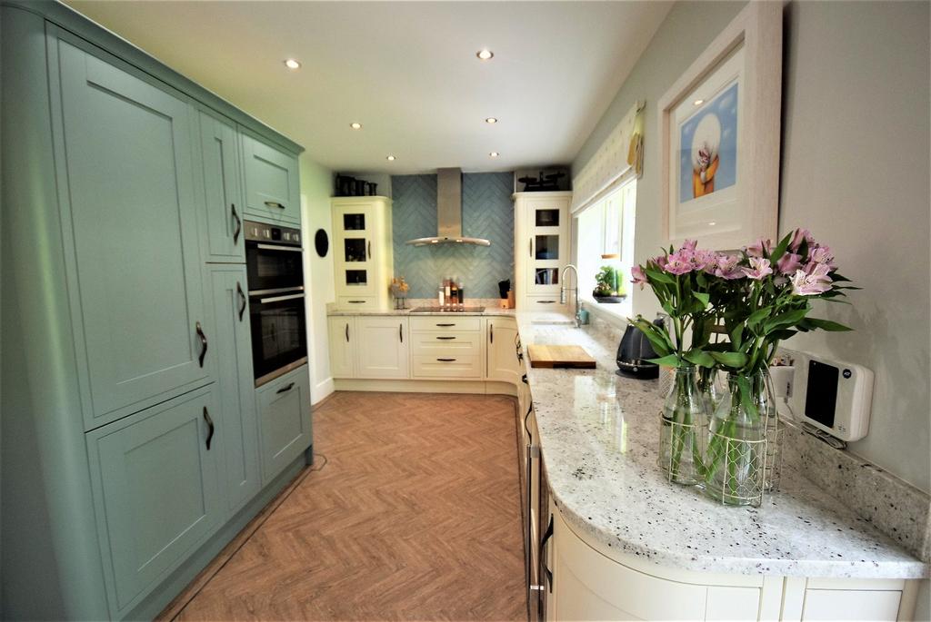 The current owners upgraded and designed the kitchen, which features an excellent selection of shaker-style wall and base units, some in duck egg blue with others contrasting in pastle cream. The solid marble worktops contain a 5-ring Neff electric induction hobb with an overhead extractor. Additional integrated appliances include a dishwasher, washing machine, under-counter freezer, and tall fridge, perfect for feeding a large family.
