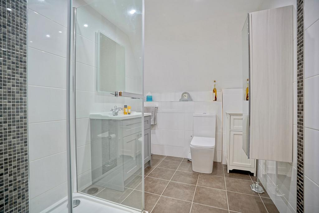 Re-fitted in a range of contemporary white sanitaryware comprising new vanity wash hand basin with mixer tap, low level WC, screened oversized shower enclosure with independent shower over and hand held mixer shower attachment, shelved recess, heated towel rail, display cabinet, Porcelanosa tiling with glass contour border tiling, recessed lighting, extractor, ceramic tiled flooring.