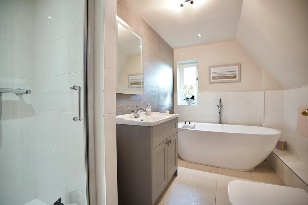 Re-fitted in a range of quality white sanitaryware comprising low level WC, screened shower enclosure with independent shower unit fitted over, central freestanding bath with hand mixer shower, new vanity wash hand basin, sealed unit window to side aspect, recessed lighting, shaver point, extractor, contemporary vertical radiator, recessed lighting, Porcelanosa floor tiling.