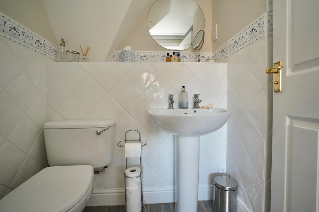 Fitted in a two piece white suite comprising low level WC, pedestal wash hand basin, extensive tiling with contour border tiling, heated towel rail, extractor, contemporary ceramic floor tiling, coving to ceiling.