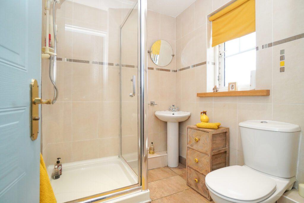 On the upper floor, the bright landing provides access to all rooms. The main bedroom is finished in contemporary styling and is located to the front. There are inbuilt wardrobes and an ensuite shower room off. Bedroom two is finished in neutral tones and benefits from a double sized inbuilt wardrobe. Bedroom three is a well proportioned single room. The immaculate bathroom is fully tiled and has a feature Jacuzzi-style bath with an electric over-bath shower. There is a storage cupboard on the landing and a ceiling hatch to the loft storage space.
