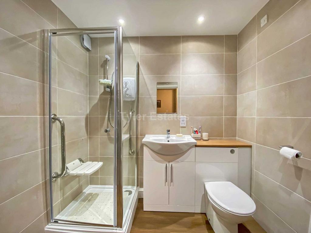 A new modern bathroom including an electric shower within cubicle, white vanity unit with wash hand basin and w.c. The walls are fully tiled and there is a built in cupboard, handy for storage. Spotlights to the ceiling, vinyl flooring and extractor fan fitted. A pull cord for the Careline system is within the bathroom.