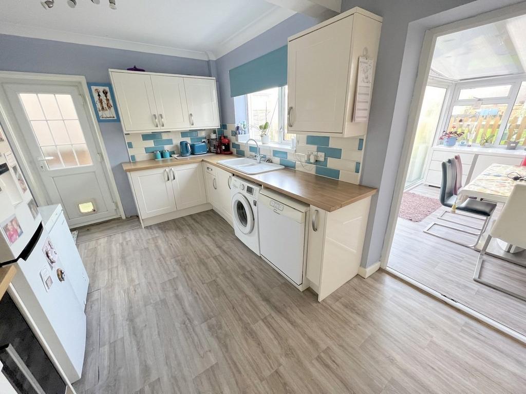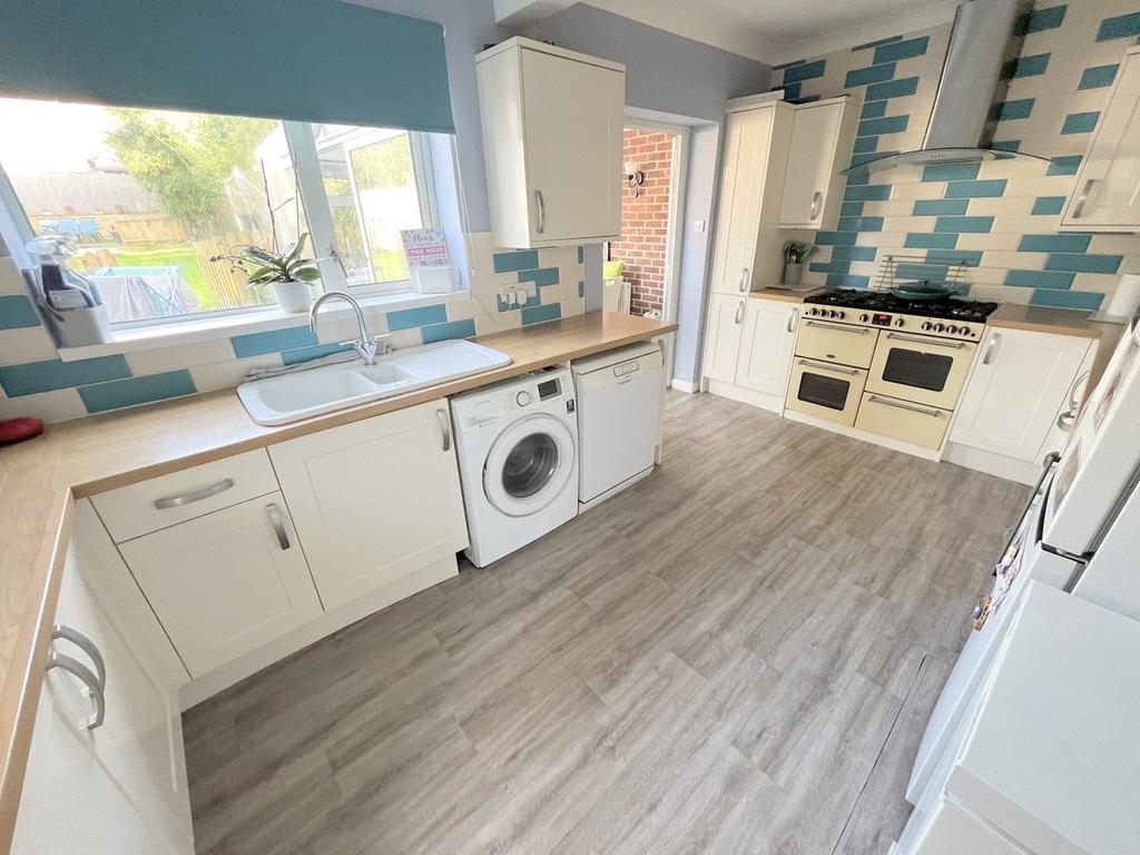 - Modern kitchen fitted in a range of cream units with wood effect work tops. Fitted with a range cooker, extraction over and space and plumbing for washing machine, dishwasher, and fridge/freezer