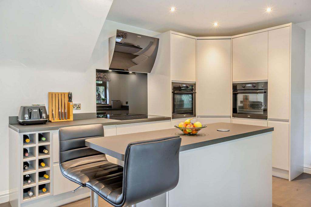 The contemporary kitchen is spacious and bright, fitted with a superb range of handleless matt finish units including a walk-in corner larder. A central island unit provides further storage and preparation space, pop-up power points, and a breakfast bar-style seating area. There is a comprehensive range of integrated appliances and a sleek multi-function extractor fan over the induction hob.
