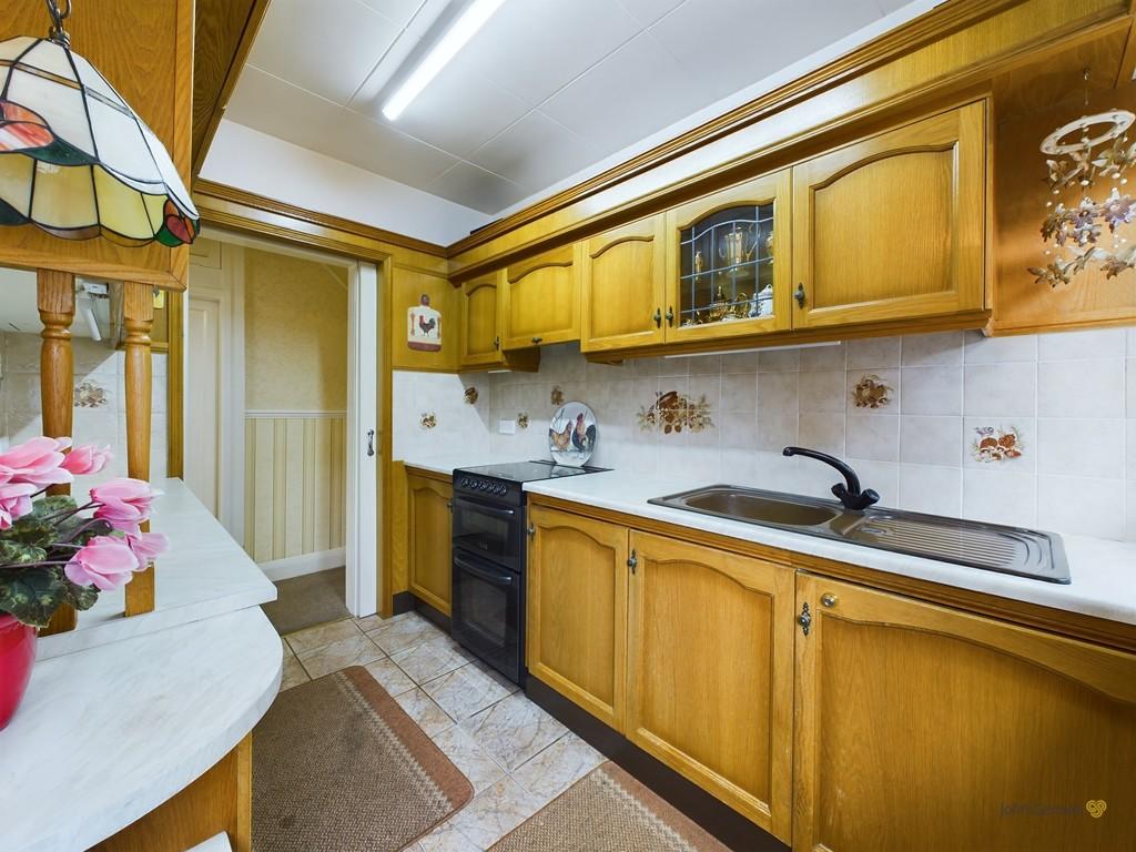 The kitchen is fitted with a matching range of wall and base units with laminate work surfaces over, tiled splashbacks, inset stainless steel sink with drainer and mixer tap over, and space for freestanding kitchen appliances. There are two windows to the side aspect and a door opening out onto the side driveway.