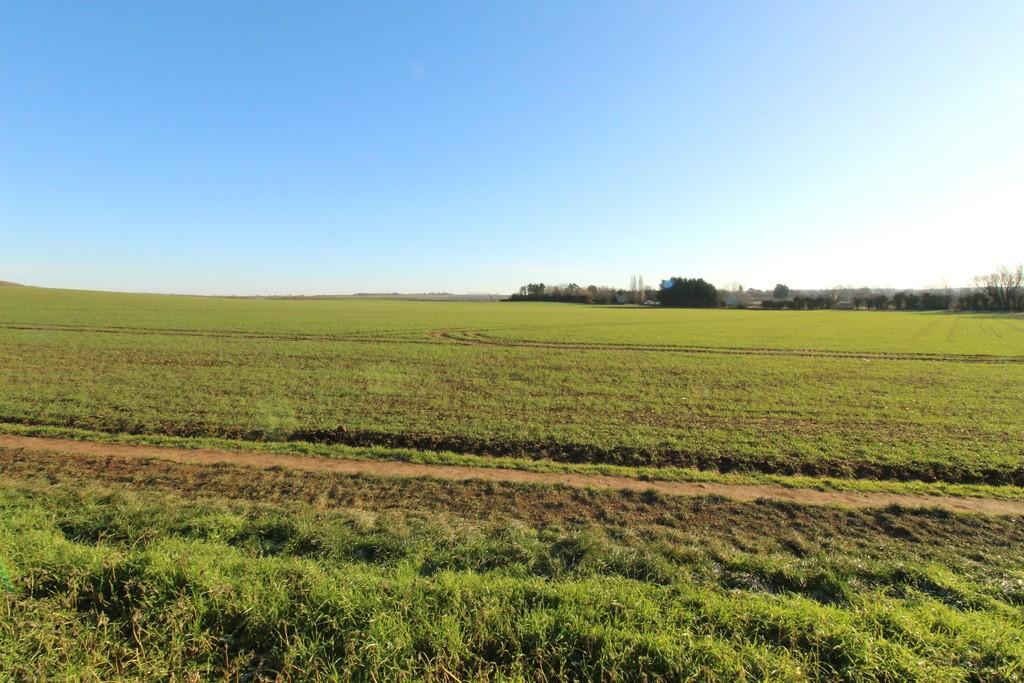 REAR GARDEN Large patio area, leading to lawn, open views to the side over farmland and to Gamlingay Woods beyond.