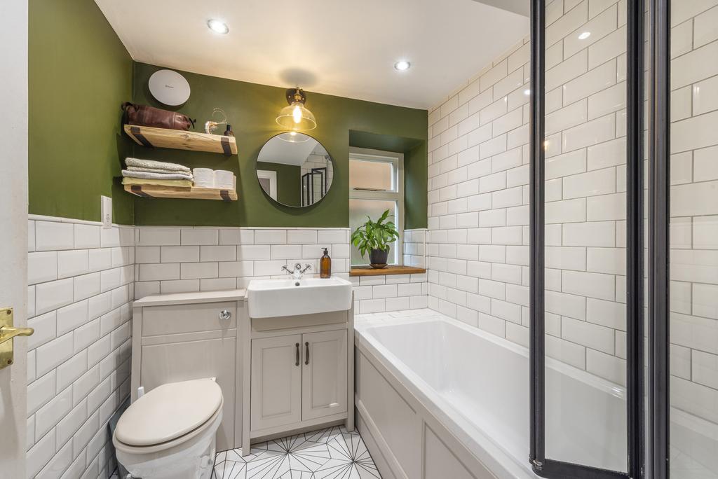 Inside the property, a modern ambiance is prevalent, characterized by splendid wooden floors and the presence of period-style features. Upon entering through a private separate entrance, you encounter a stylish kitchen equipped with integrated appliances and white tiling.