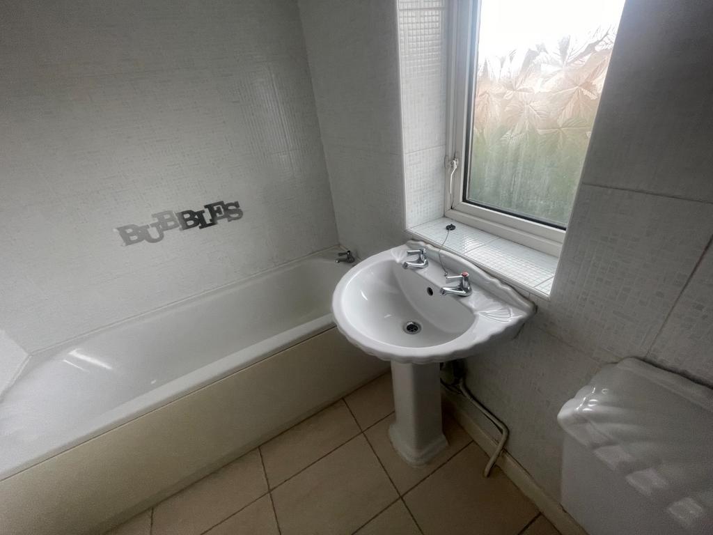 Fully Tiled With Modern White Suite - Bath, Pedestal Sink & Toilet.
