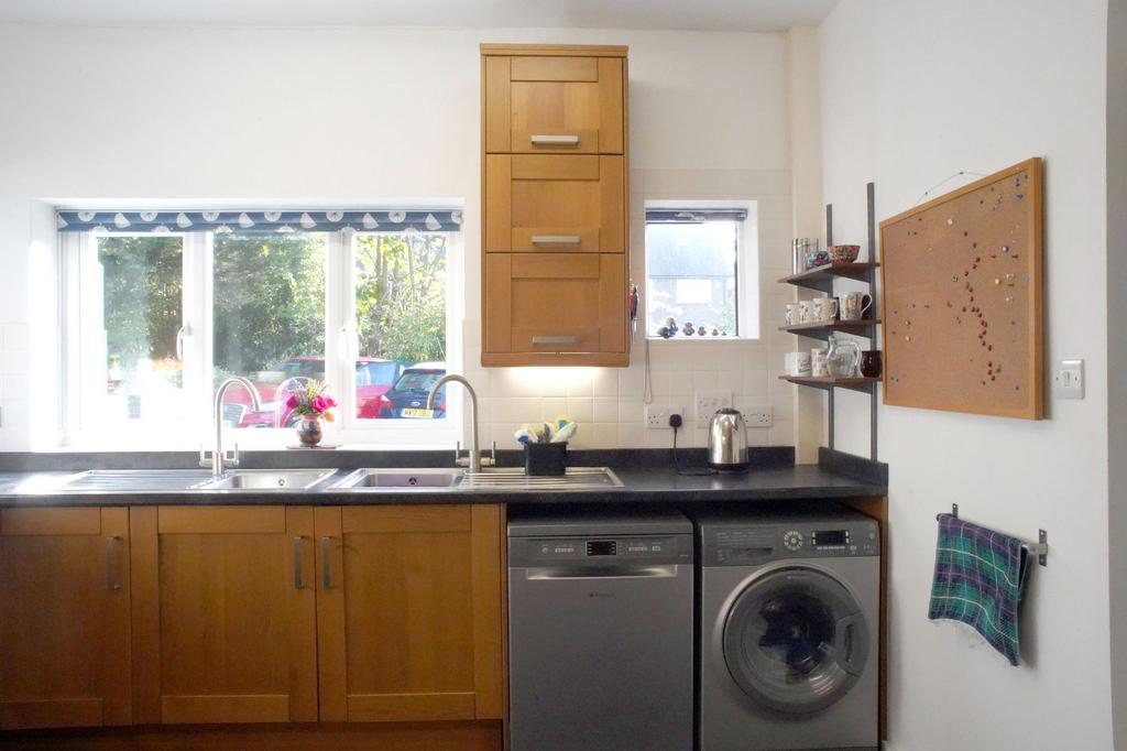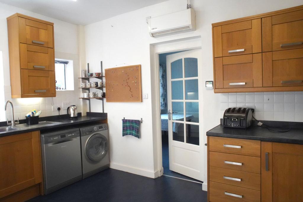 On the right, the conveniently located dining room leads to the spacious kitchen. The kitchen is a bright room with dual aspect windows/side door opening onto a paved area with a small storage unit housing the oil-fired boiler. The kitchen is fitted with an integrated chest high oven/grill and hob with additional oven below, two single basin sinks, plentiful fitted units and spaces for fridge/freezer/washing machine/dishwasher.