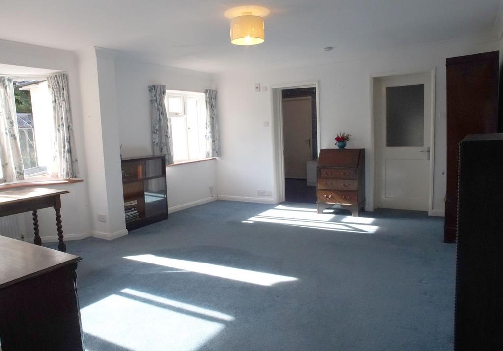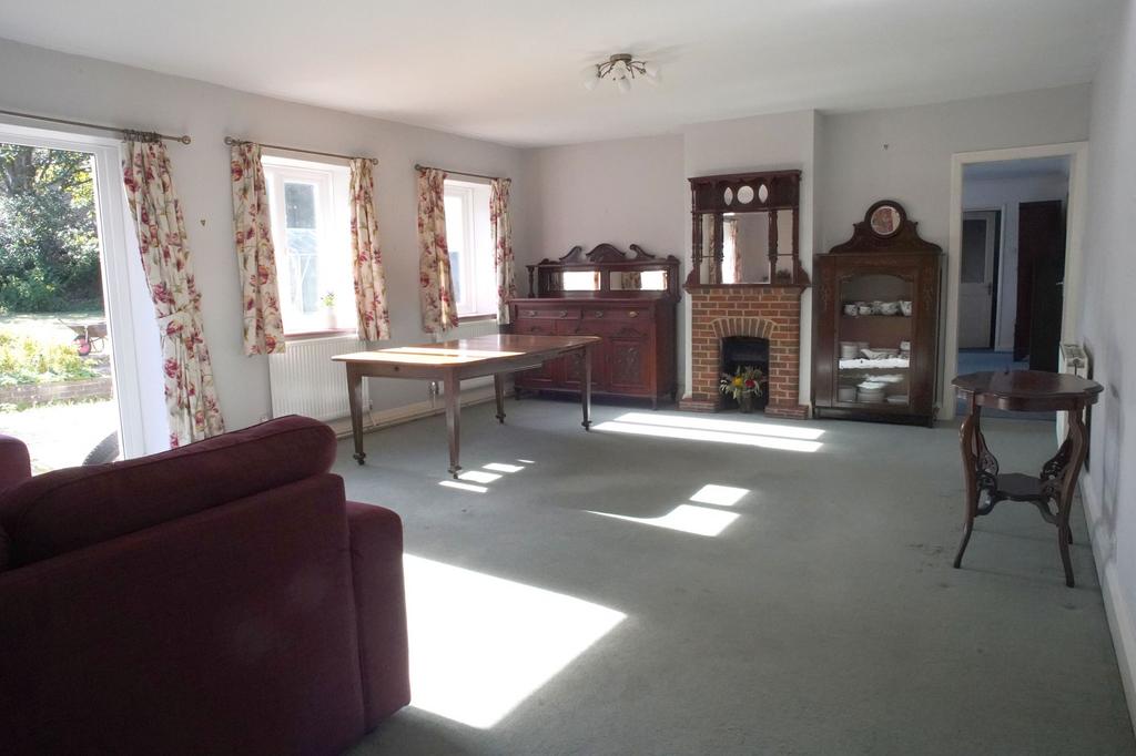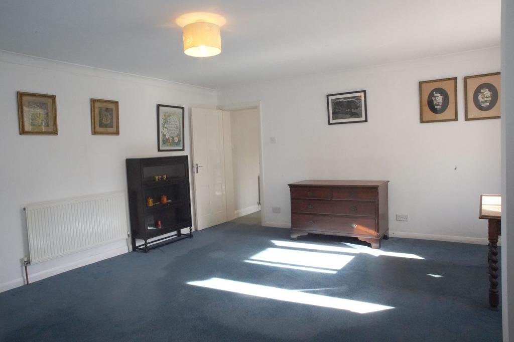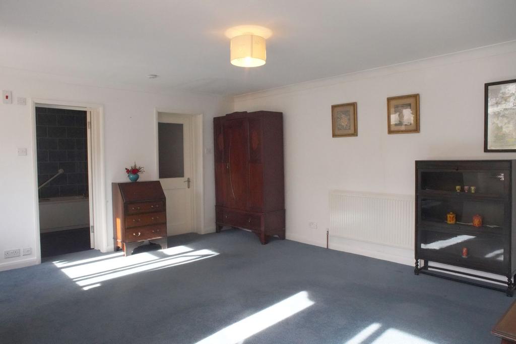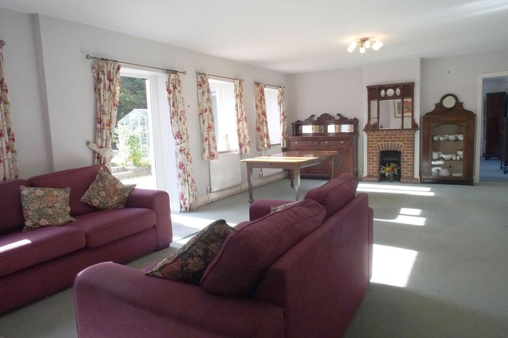 To the left is an exceptionally spacious living room with a wood burner at one end and an open fireplace at the other. There are windows on either side of a patio door which opens to the front of the house, these allow ample natural light into the living room giving a lovely view of the garden. Beyond the open fireplace a door leads into the downstairs bedroom. The bedroom is a large, bright room with a dressing room and a 4-piece en-suite with a walk-in shower, bath, w/c, basin and heated towel rail. From the en-suite, there is access to a store room/workshop with a further door leading into the double garage. Above the garage is a converted loft room, providing potential office space, games room, workroom or storage.