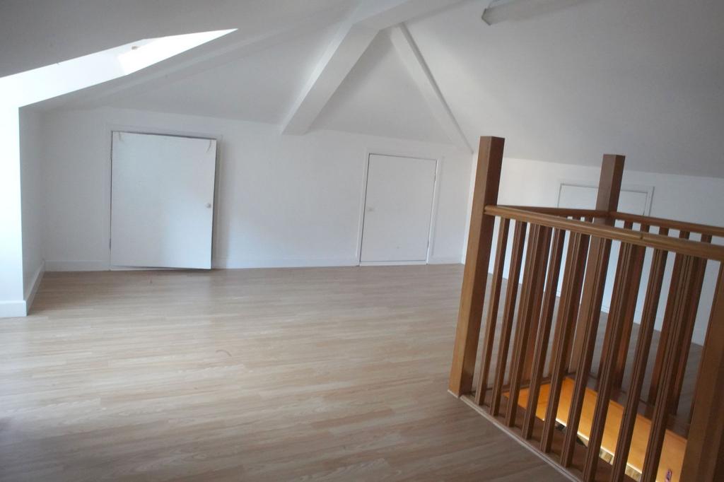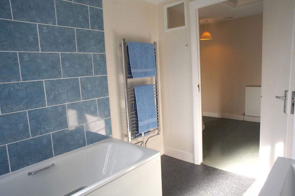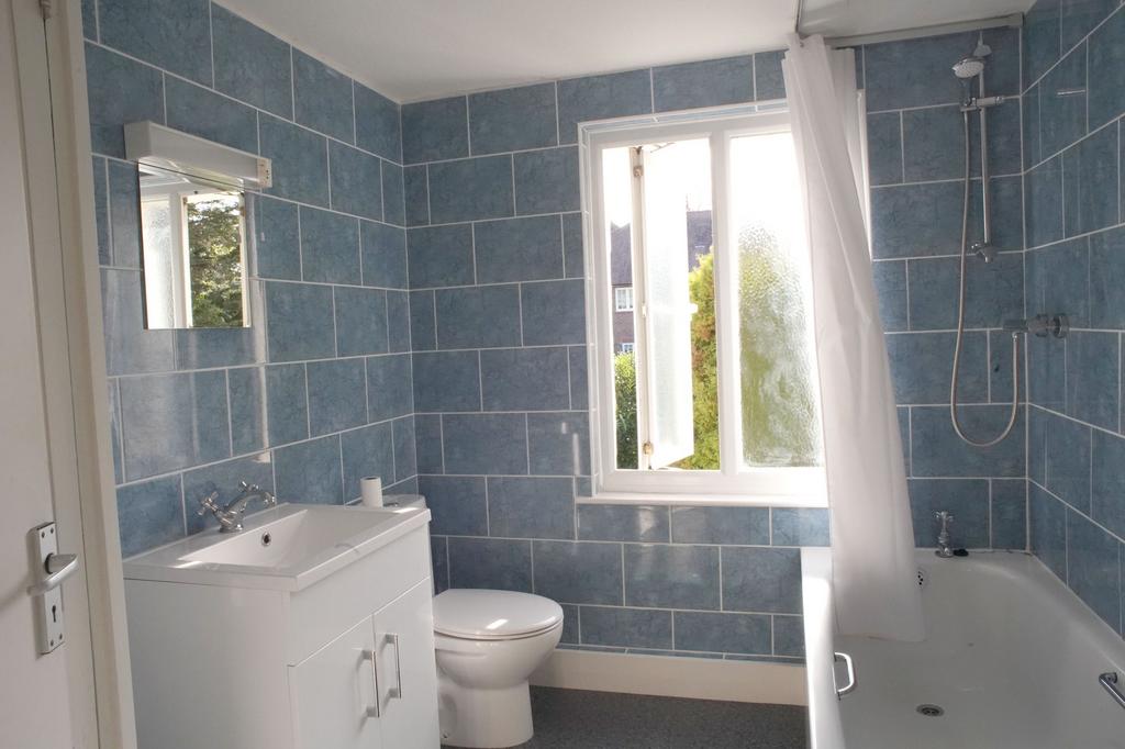 Back at the entrance hall, stairs lead up to the first floor landing with doors to all rooms and a cupboard housing the hot water tank. There is a Velux window over the staircase allowing natural light onto the landing. Here there are two bedrooms and a bathroom. The bathroom is fitted with a 3-piece suite with shower over bath, basin, w/c, heated towel rail and a linen cupboard.