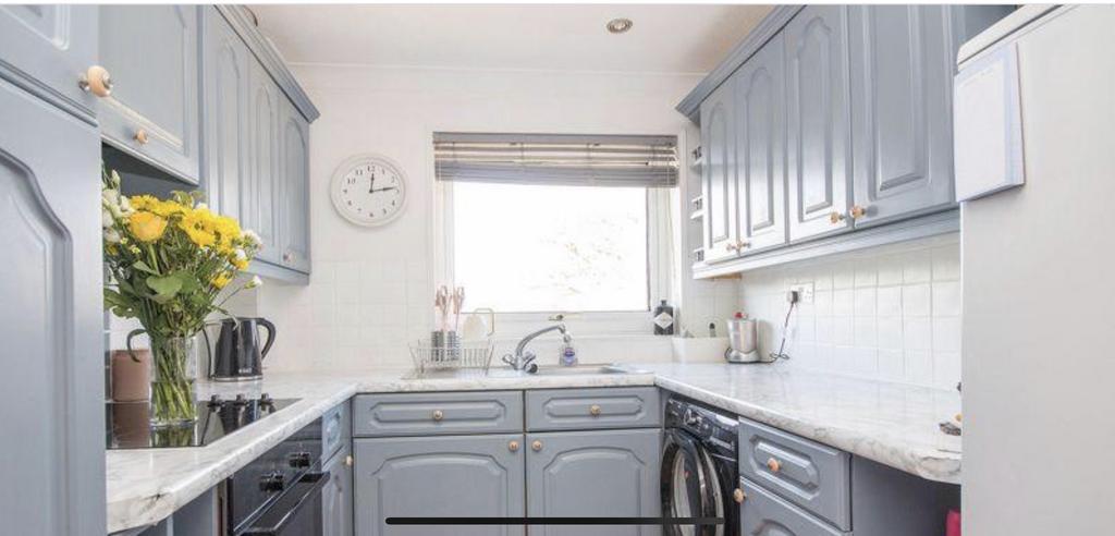 The sleek kitchen enjoys classic shaker-style cabinetry in muted blue tones, complemented by crisp marble-effect worktops and built-in appliances. With ample counter space and storage, this kitchen enhances both practicality and visual appeal for aspiring chefs.