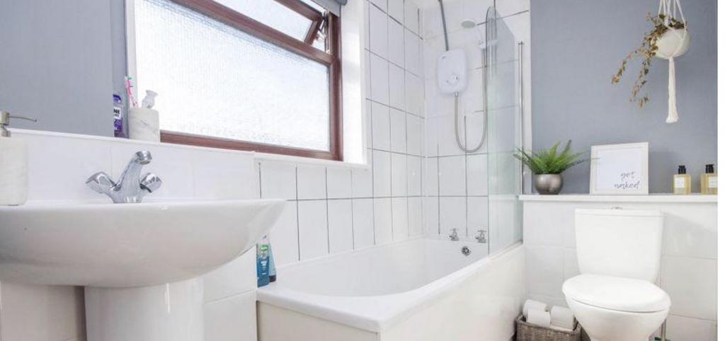 Both double bedrooms are well-proportioned and peaceful, with large windows framing leafy outlooks, creating restful retreats to unwind. The bathroom is finished with modern, fresh tiling and features a full-sized bath with overhead shower, pedestal sink and low-level WC—making for a functional yet relaxing space.