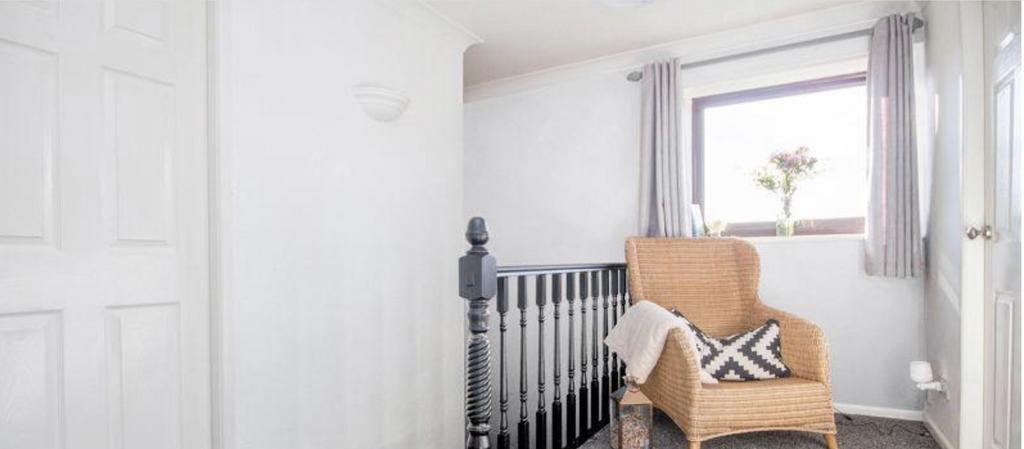 Inside, the home welcomes you with its neutral décor and fresh feel. Upon ascending the private entrance stairs, a bright and spacious landing creates an immediate sense of space, offering a useful sitting area. The lounge is generously sized and stylish, featuring plush carpeting and a large window that basks the room in light—perfect for relaxing or entertaining.