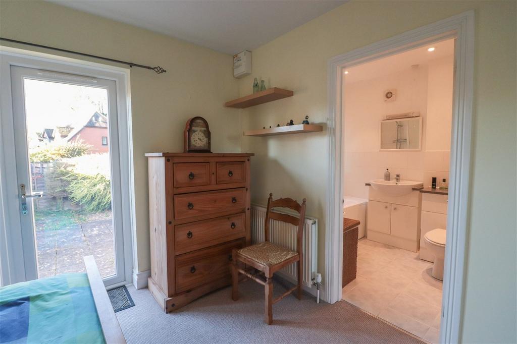 The double bedroom has a built-in double wardrobe and a door to the garden. The bathroom features a white suite with a P-shaped bath, with a shower above and glass screen, a wash hand basin with vanity storage, wc, heated towel rail, ceiling extractor and part-tiled walls.