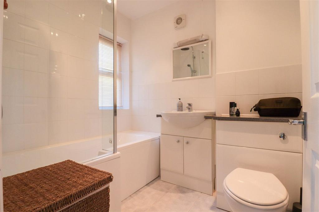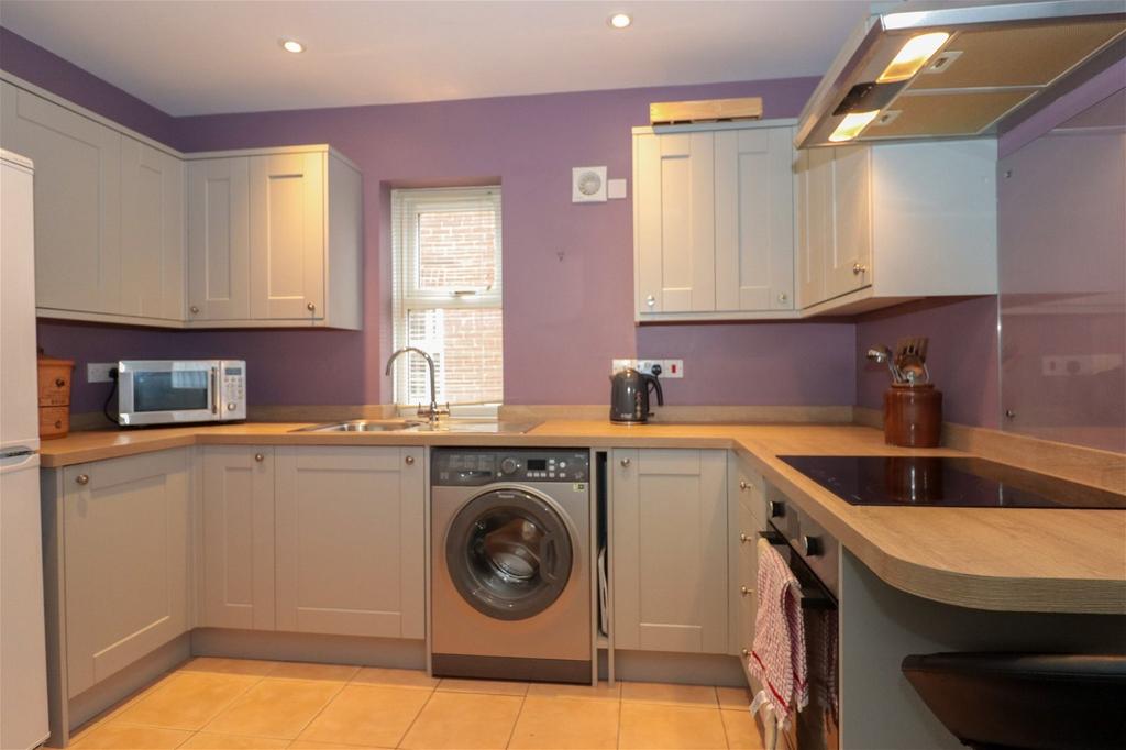 The front door is approached from the driveway, with the front door opening to a hallway where there is a cupboard housing the gas boiler. From the hall, a door opens to the living room, which has a window to the front and a recess, which would be ideal for a cupboard or shelving. The kitchen is open-plan from the living room, and features a range of wall and base level units and drawers, with wood-effect worksurfaces. There is a stainless steel sink with drainer, a built-in oven, an electric hob with an extractor above.