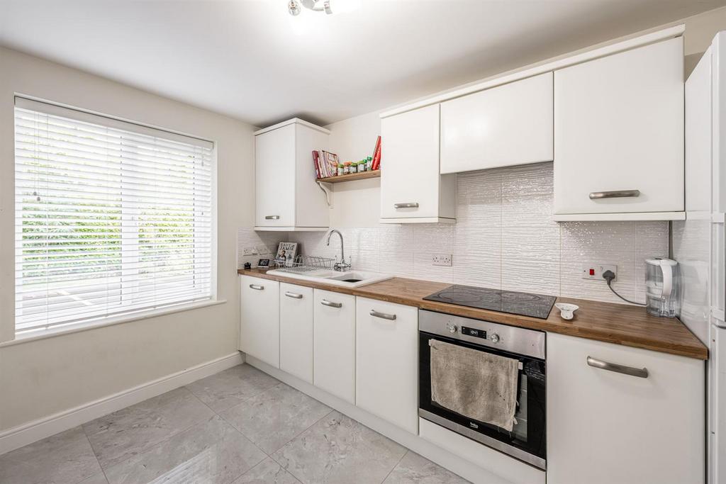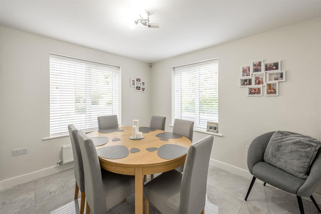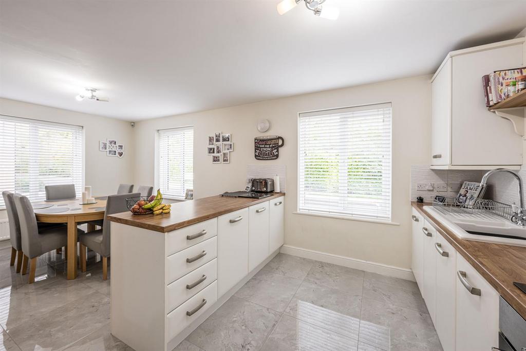 Kitchen Dining Room - 5.98m x 3.58m (19'7" x 11'8") - With a door leading from the entrance hall, this modern fitted kitchen has a range of wall and base units, work surfaces with tiled splash back, integrated electric oven, electric hob with extractor above, integrated dishwasher, space for tall fridge freezer, one and a half bowl ceramic sink and drainer, double glazed window to front, two double glazed windows to side, space for dining table and opening to the utility area and two central heating radiators.