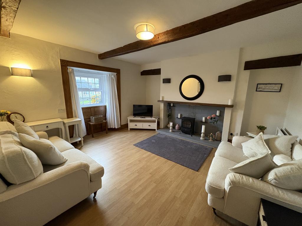 Lounge (4.18m x 3.97m) with ceiling beams, two radiators, TV point, oak effect laminate flooring, fireplace recess with boarded flue opening and electric stove on tiled hearth, 3 wall lights and double glazed window to front.