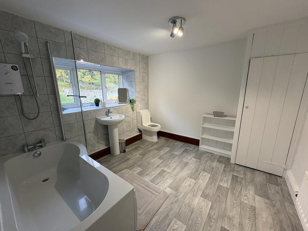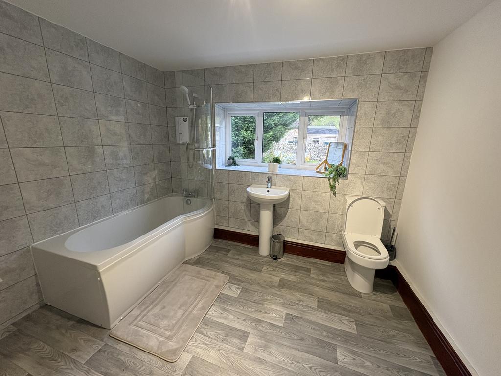 Bathroom (3.11m x 2.99m) Bathroom suite in white comprising W.C., pedestal basin, shower bath with Mira Sport electric shower over, shower screen, tiling to two walls, radiator, airing cupboard with hot water cylinder and immersion heater, double glazed window to rear, 3 spot light fitting and laminate effect vinyl flooring.