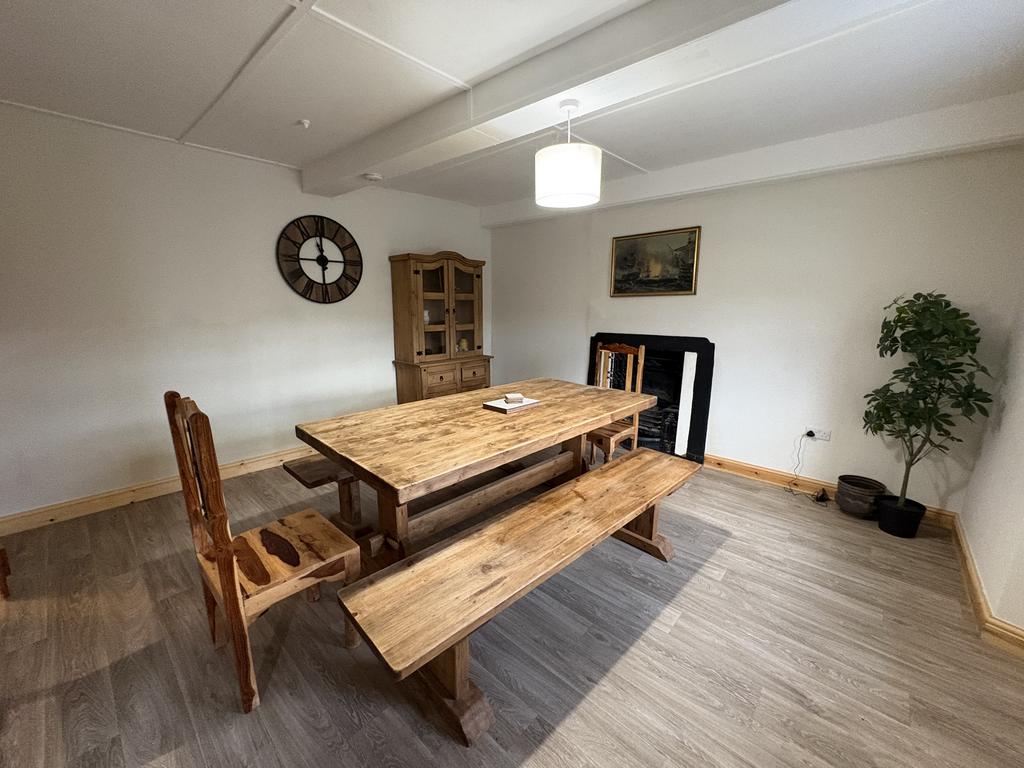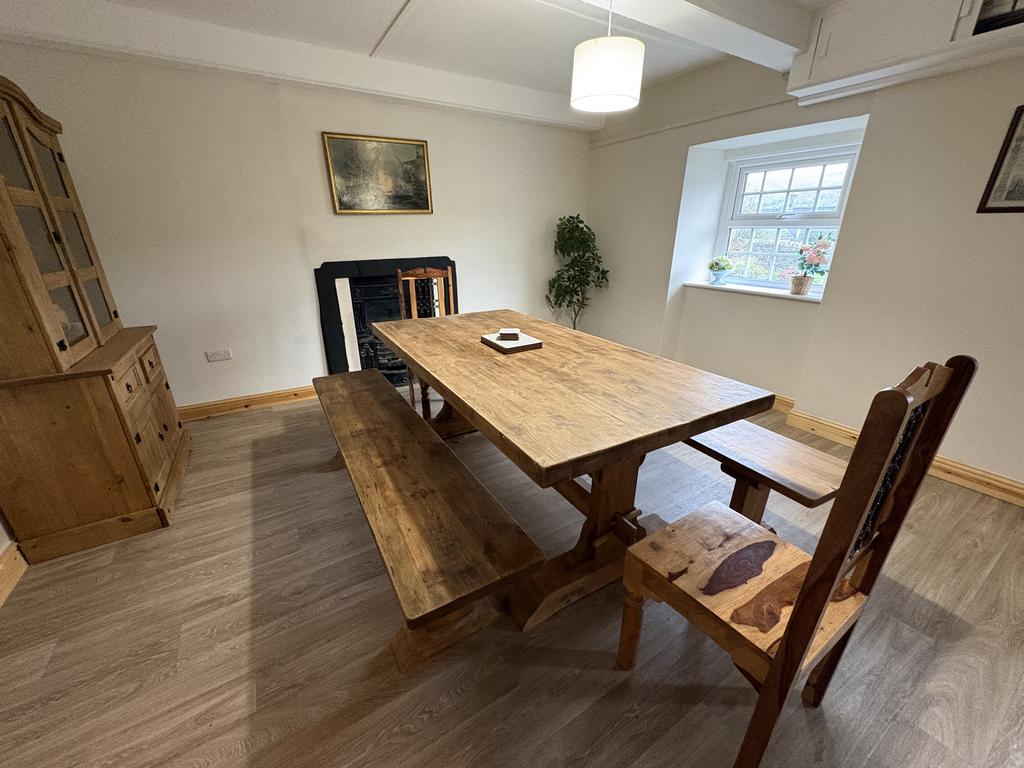 Dining Room (5.48m x 4.18m) with feature cast iron fireplace grate, double glazed window to front, high level cupboard housing electric consumer unit and meter, smoke alarm and laminate effect vinyl. Door through to:-