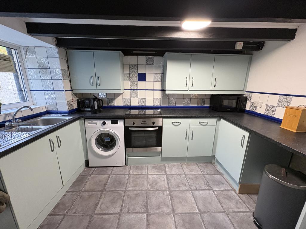 Kitchen (3.01m x 2.99m) with range of painted timber wall and floor units, dark laminate worktops, stainless steel 1 ½ bowl sink unit and drainer, built in electric oven and 4 ring induction hob, tiled splashbacks, plumbing for washing machine, extractor fan, tile effect laminate flooring and double glazed window to rear. Part glazed door to Garden Room/Boot Room.